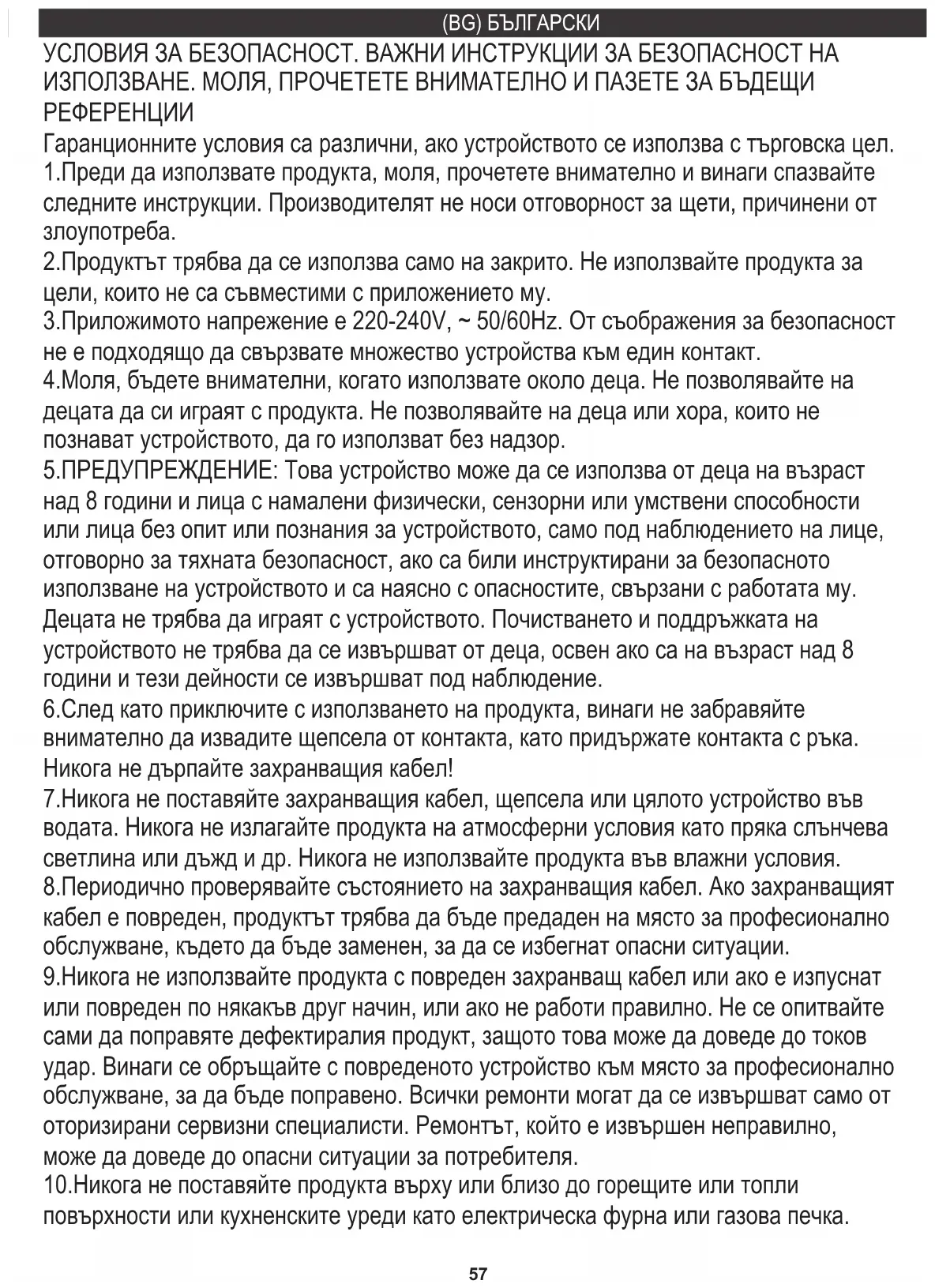 4.Моля, бъдете внимателни, когато използвате около деца. Не позволявайте на децата да си играят с продукта. Не позволявайте на деца или хора, които не познават устройството, да го използват без надзор. Гаранционните условия са различни, ако устройството се използва с търговска цел. 9.Никога не използвайте продукта с повреден захранващ кабел или ако е изпуснат или повреден по някакъв друг начин, или ако не работи правилно. Не се опитвайте сами да поправяте дефектиралия продукт, защото това може да доведе до токов удар. Винаги се обръщайте с повреденото устройство към място за професионално обслужване, за да бъде поправено. Всички ремонти могат да се извършват само от оторизирани сервизни специалисти. Ремонтът, който е извършен неправилно, може да доведе до опасни ситуации за потребителя. 1.Преди да използвате продукта, моля, прочетете внимателно и винаги спазвайте следните инструкции. Производителят не носи отговорност за щети, причинени от злоупотреба. 6.След като приключите с използването на продукта, винаги не забравяйте внимателно да извадите щепсела от контакта, като придържате контакта с ръка. Никога не дърпайте захранващия кабел! 5.ПРЕДУПРЕЖДЕНИЕ: Това устройство може да се използва от деца на възраст над 8 години и лица с намалени физически, сензорни или умствени способности или лица без опит или познания за устройството, само под наблюдението на лице, отговорно за тяхната безопасност, ако са били инструктирани за безопасното използване на устройството и са наясно с опасностите, свързани с работата му. Децата не трябва да играят с устройството. Почистването и поддръжката на устройството не трябва да се извършват от деца, освен ако са на възраст над 8 години и тези дейности се извършват под наблюдение. 2.Продуктът трябва да се използва само на закрито. Не използвайте продукта за цели, които не са съвместими с приложението му. 7.Никога не поставяйте захранващия кабел, щепсела или цялото устройство във водата. Никога не излагайте продукта на атмосферни условия като пряка слънчева светлина или дъжд и др. Никога не използвайте продукта във влажни условия. 3.Приложимото напрежение е 220-240V, ~ 50/60Hz. От съображения за безопасност не е подходящо да свързвате множество устройства към един контакт.58 27.Устройството не е проектирано да работи с външни програми за планиране или отделна система за дистанционно управление. 28.Не мийте поставката на каната директно във водата, а само избършете със суха