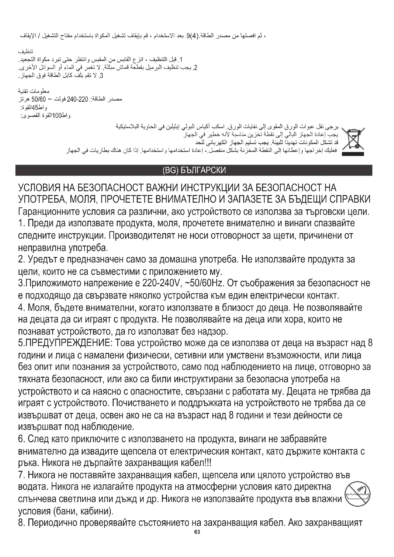 18. Не оставяйте устройството без надзор, когато е включено в контакта.