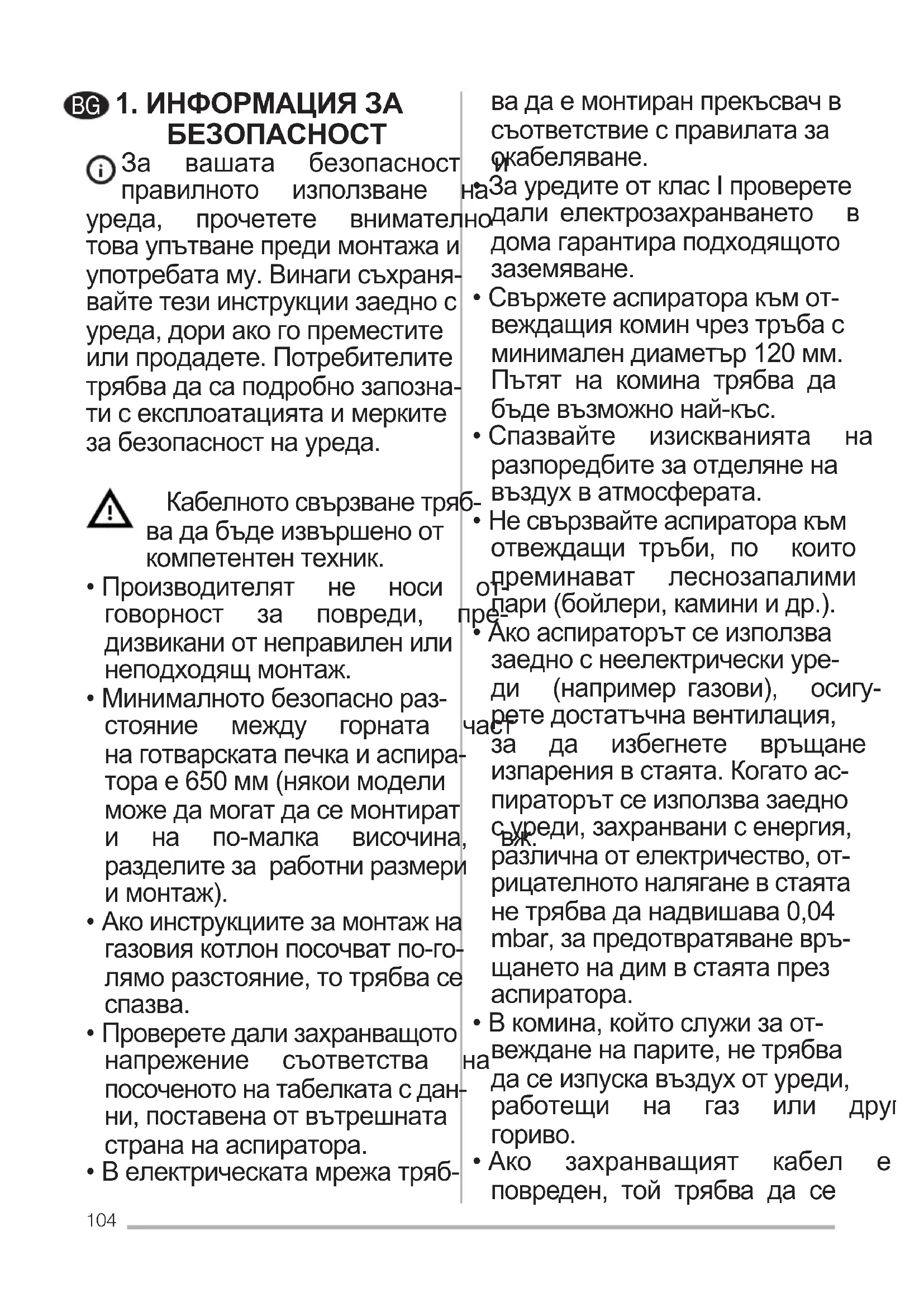 - DeğiştirmekiçinTeknikServisle bağlantı kurun(“Edinmekiçinteknikservislebağ- lantıkurun”).104 1.ИНФОРМАЦИЯЗА БЕЗОПАСНОСТ За вашата безопасност и правилното използване на уреда, прочетете внимателно товаупътванепредимонтажаи употребатаму.Винагисъхраня- вайтетезиинструкциизаеднос уреда,дориакогопреместите илипродадете.Потребителите трябвадасаподробнозапозна- тисексплоатациятаимерките забезопасностнауреда. Кабелнотосвързванетряб- вадабъдеизвършеноот компетентентехник.