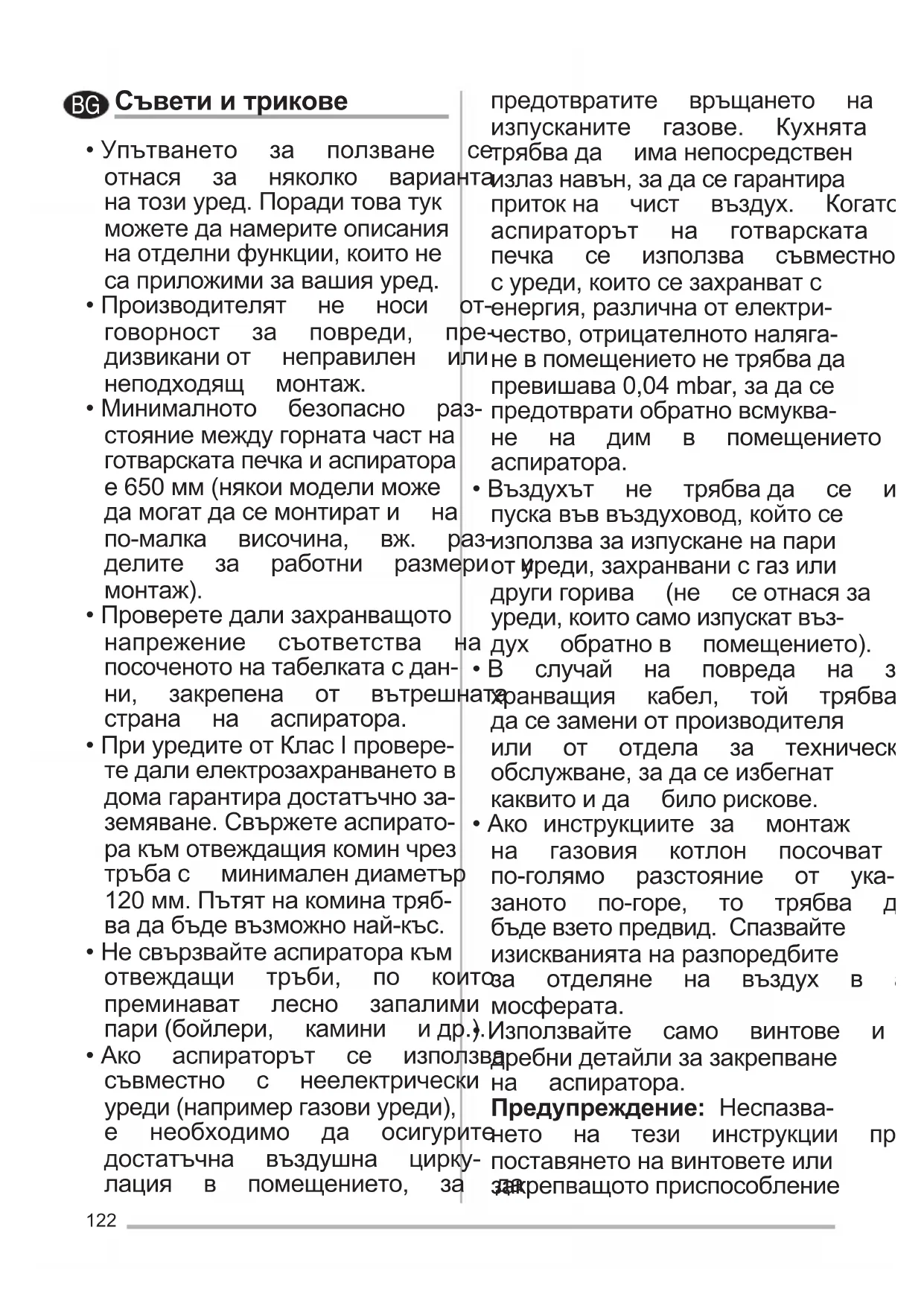 - Ако аспираторът се използва съвместно с неелектрически уреди(напримергазовиуреди), е необходимо да осигурите достатъчна въздушна цирку- лация в помещението, за да предотвратите връщането на изпусканите газове. Кухнята трябвада иманепосредствен излазнавън,задасегарантира притокна чист въздух. Когато аспираторът на готварската печка се използва съвместно суреди,коитосезахранватс енергия,различнаотелектри- чество,отрицателнотоналяга- невпомещениетонетрябвада превишава0,04mbar,задасе предотвратиобратновсмуква- не на дим в помещението от аспиратора.