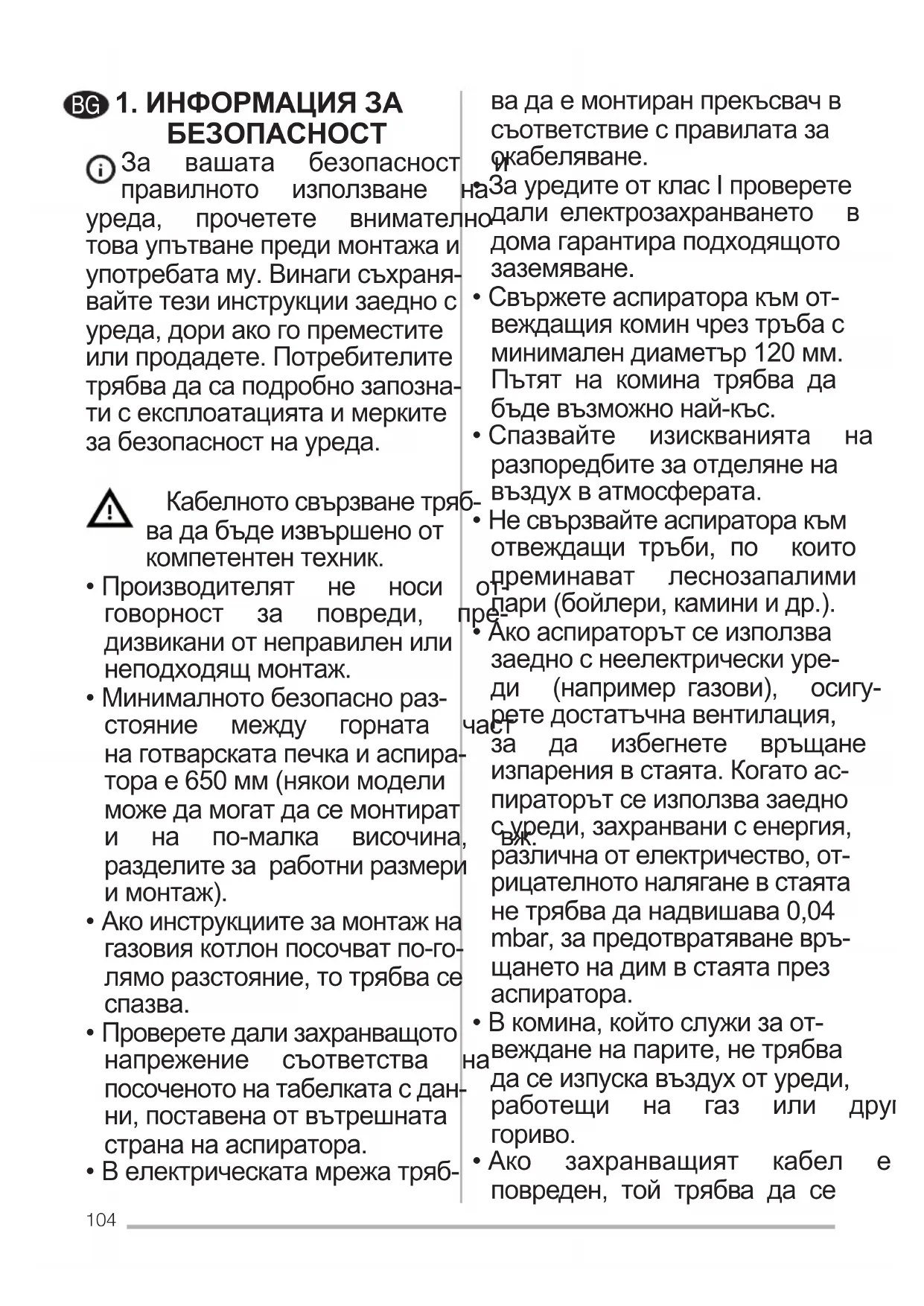 - DeğiştirmekiçinTeknikServisle bağlantı kurun(“Edinmekiçinteknikservislebağ- lantıkurun”).104 1.ИНФОРМАЦИЯЗА БЕЗОПАСНОСТ За вашата безопасност и правилното използване на уреда, прочетете внимателно товаупътванепредимонтажаи употребатаму.Винагисъхраня- вайтетезиинструкциизаеднос уреда,дориакогопреместите илипродадете.Потребителите трябвадасаподробнозапозна- тисексплоатациятаимерките забезопасностнауреда. Кабелнотосвързванетряб- вадабъдеизвършеноот компетентентехник.