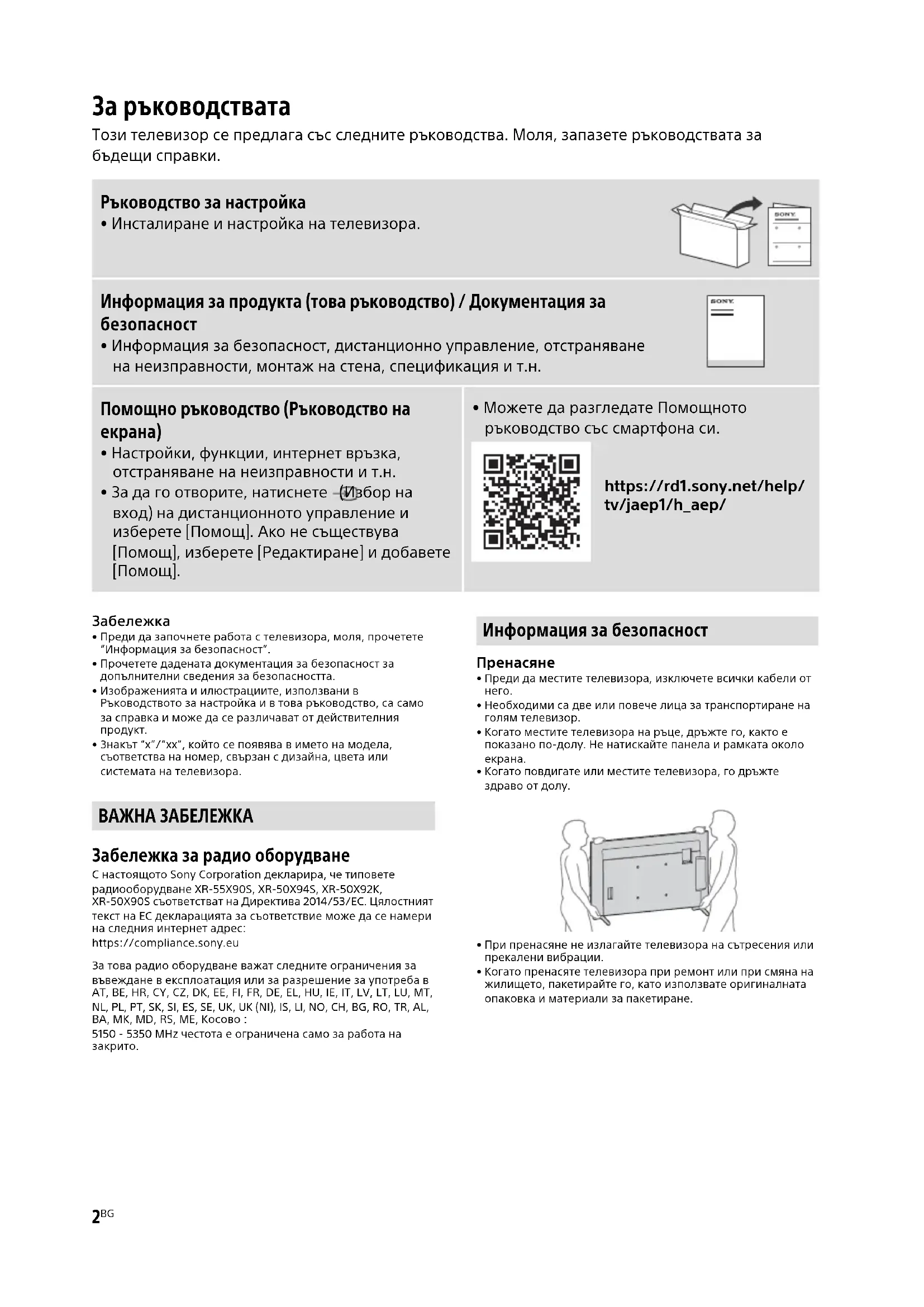 - Можете да разгледате Помощното ръководство със смартфона си. https://rd1.sony.net/help/ tv/jaep1/h_aep/ ВАЖНА ЗАБЕЛЕЖКА Информация за безопасност3