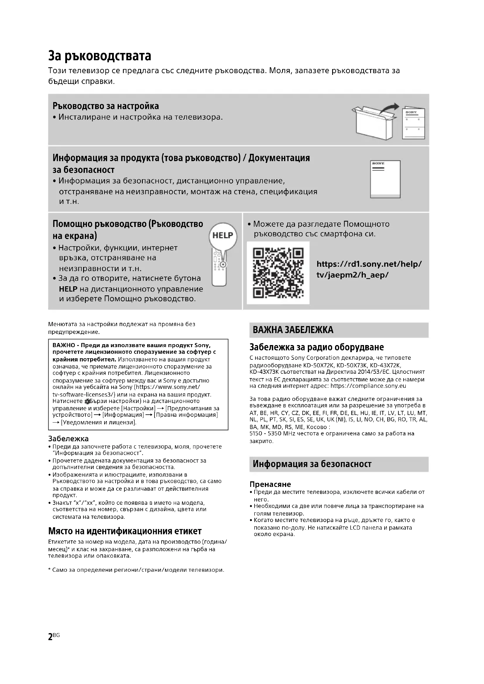 - Можете да разгледате Помощното ръководство със смартфона си. https://rd1.sony.net/help/ tv/jaepm2/h_aep/ ВАЖНО - Преди да използвате вашия продукт Sony, прочетете лицензионното споразумение за софтуер с крайния потребител. Използването на вашия продукт означава, че приемате лицензионното споразумение за софтуер с крайния потребител. Лицензионното споразумение за софтуер между вас и Sony е достъпно онлайн на уебсайта на Sony (https://www.sony.net/ tv-software-licenses3/) или на екрана на вашия продукт. Натиснете (Бързи настройки) на дистанционното управление и изберете [Настройки] [Предпочитания за устройството] [Информация] [Правна информация] [Уведомления и лицензи]. ВАЖНА ЗАБЕЛЕЖКА Информация за безопасност3