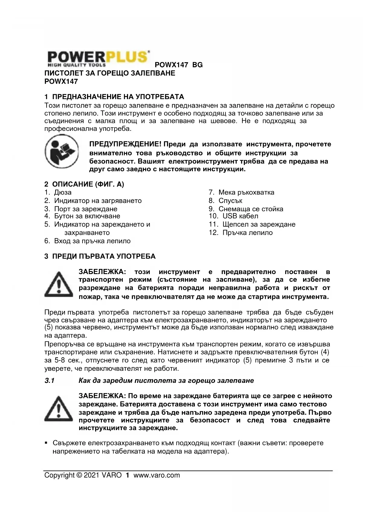 ПРИМЕЧАНИЕ: клеевой пистолет выключается автоматически через 10 минут для экономии энергии.POWX147 BG Copyright © 2021 VARO 1 www.varo.com ПИСТОЛЕТ ЗА ГОРЕЩО ЗАЛЕПВАНЕ POWX147 1 ПРЕДНАЗНАЧЕНИЕ НА УПОТРЕБАТА Този пистолет за горещо залепване е предназначен за залепване на детайли с горещо стопено лепило. Този инструмент е особено подходящ за точково залепване или за съединения с малка площ и за залепване на шевове. Не е подходящ за професионална употреба. ПРЕДУПРЕЖДЕНИЕ! Преди да използвате инструмента, прочетете внимателно това ръководство и общите инструкции за безопасност. Вашият електроинструмент трябва да се предава на друг само заедно с настоящите инструкции. 2 ОПИСАНИЕ (ФИГ. A)