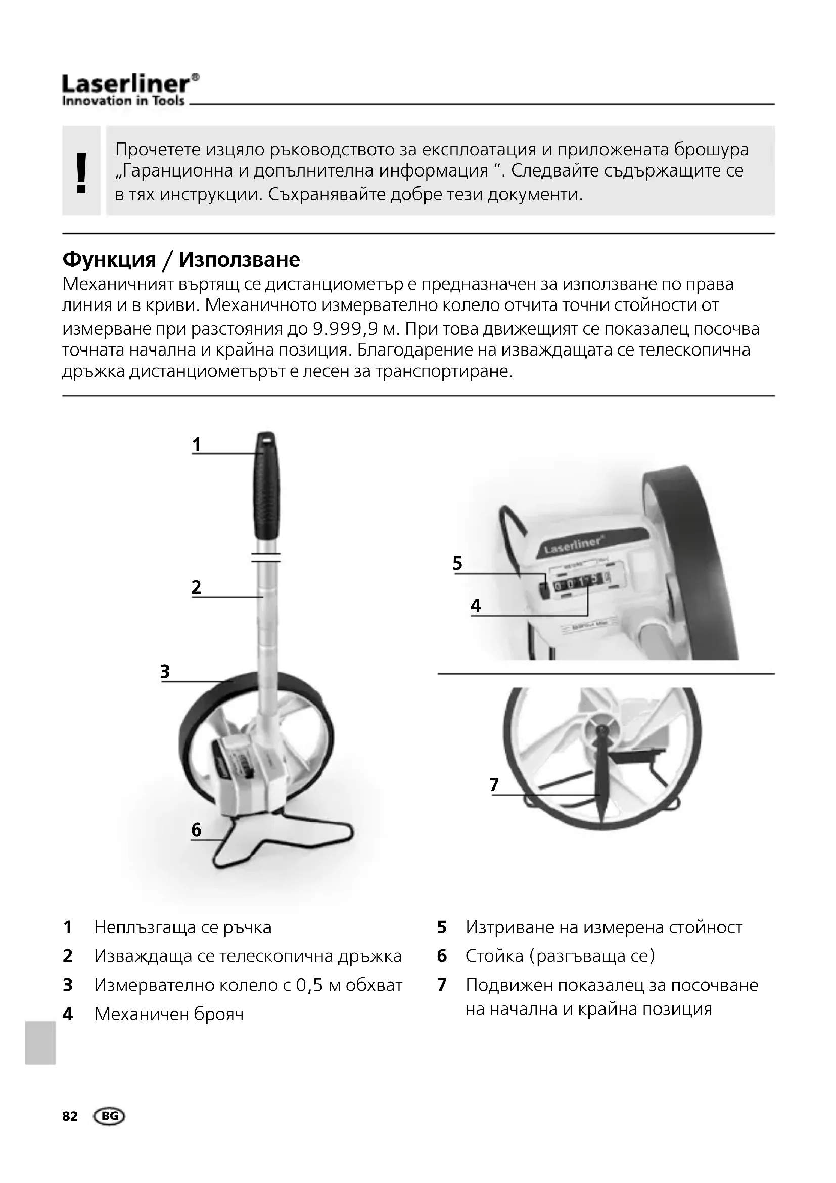 Функция / Използване Механичният въртящ се дистанциометър е предназначен за използване по права линия и в криви. Механичното измервателно колело отчита точни стойности от измерване при разстояния до 9.999,9 м. При това движещият се показалец посочва точната начална и крайна позиция. Благодарение на изваждащата се телескопична дръжка дистанциометърът е лесен за транспортиране. Неплъзгаща се ръчка Изваждаща се телескопична дръжка Измервателно колело с 0,5 м обхват Механичен брояч Изтриване на измерена стойност Стойка (разгъваща се) Подвижен показалец за посочване на начална и крайна позиция