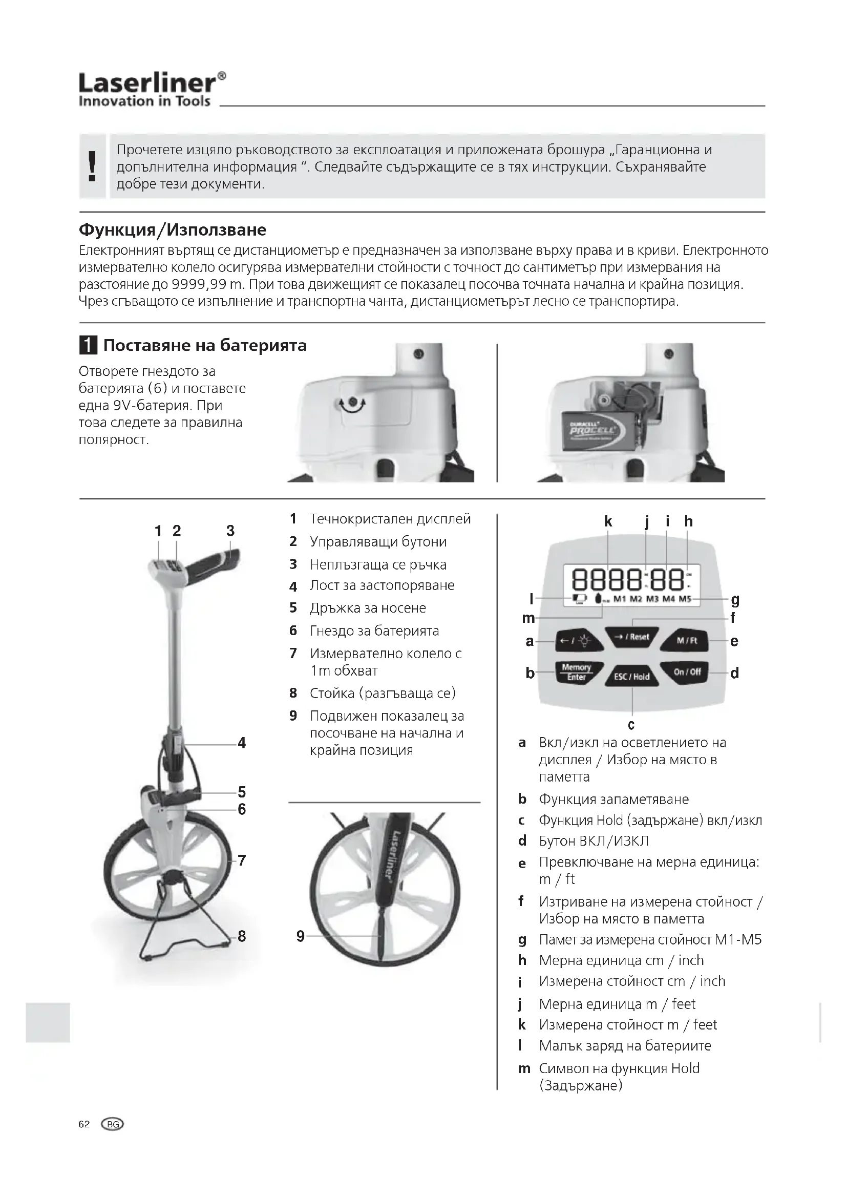 Поставяне на батерията Течнокристален дисплей Управляващи бутони Неплъзгаща се ръчка Лост за застопоряване Дръжка за носене Гнездо за батерията Измервателно колело с 1m обхват Стойка (разгъваща се) Подвижен показалец за посочване на начална и крайна позиция