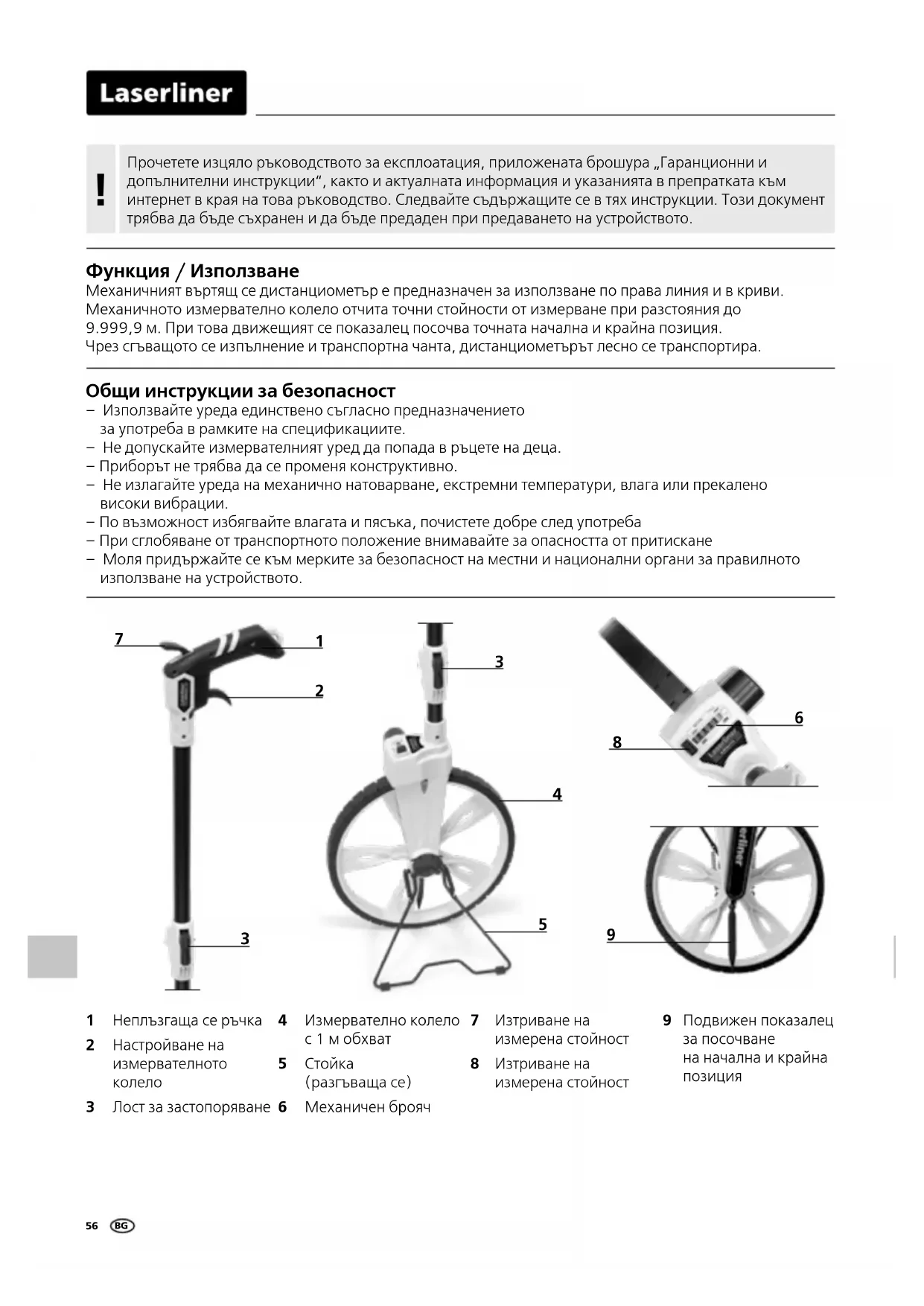 Функция / Използване Механичният въртящ се дистанциометър е предназначен за използване по права линия и в криви. Механичното измервателно колело отчита точни стойности от измерване при разстояния до 9.999,9 м. При това движещият се показалец посочва точната начална и крайна позиция. Чрез сгъващото се изпълнение и транспортна чанта, дистанциометърът лесно се транспортира. Общи инструкции за безопасност – Използвайте уреда единствено съгласно предназначението за употреба в рамките на спецификациите. – Не допускайте измервателният уред да попада в ръцете на деца. – Приборът не трябва да се променя конструктивно. – Не излагайте уреда на механично натоварване, екстремни температури, влага или прекалено високи вибрации. – По възможност избягвайте влагата и пясъка, почистете добре след употреба – При сглобяване от транспортното положение внимавайте за опасността от притискане – Моля придържайте се към мерките за безопасност на местни и национални органи за правилното използване на устройството.