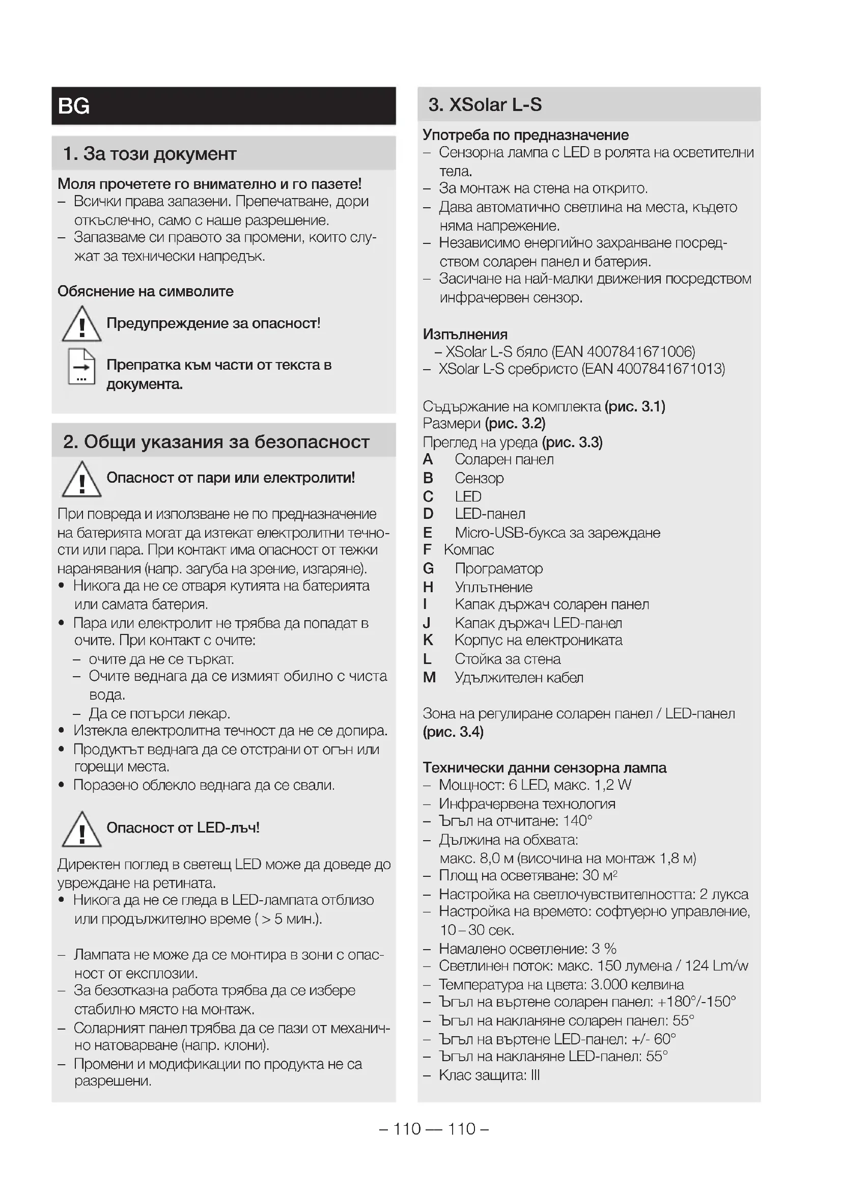 – XSolar L-S бяло (EAN4007841671006) – XSolar L-S сребристо (EAN4007841671013) Съдържание на комплекта (рис. 3.1) Размери (рис. 3.2) Преглед на уреда (рис. 3.3) A Соларен панел B Сензор C LED D LED-панел E Micro-USB-букса за зареждане F Компас G Програматор H Уплътнение I Капак държач соларен панел J Капак държач LED-панел K Корпус на електрониката L Стойка за стена M Удължителен кабел Зона на регулиране соларен панел/LED-панел (рис. 3.4) Технически данни сензорна лампа – Мощност: 6 LED, макс. 1,2 W – Инфрачервена технология – Ъгъл на отчитане: 140° – Дължина на обхвата: макс. 8,0 м (височина на монтаж 1,8 м) – Площ на осветяване: 30 м