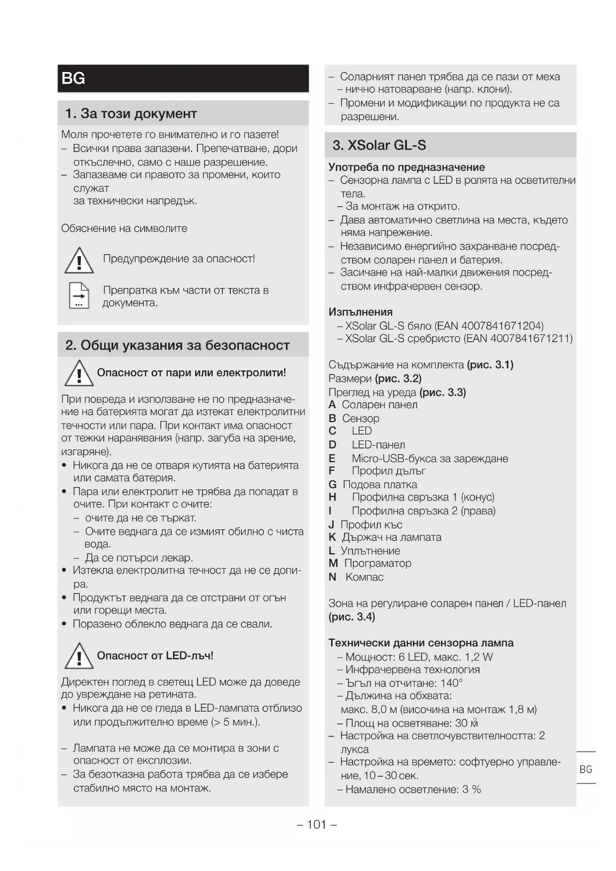 – XSolar GL-S бяло (EAN4007841671204) – XSolar GL-S сребристо (EAN4007841671211) Съдържание на комплекта (рис. 3.1) Размери (рис. 3.2) Преглед на уреда (рис. 3.3) A Соларен панел B Сензор C LED D LED-панел E Micro-USB-букса за зареждане F Профил дълъг G Подова платка H Профилна свръзка 1 (конус) I Профилна свръзка 2 (права) J Профил къс K Държач на лампата L Уплътнение M Програматор N Компас Зона на регулиране соларен панел/LED-панел (рис. 3.4) Технически данни сензорна лампа – Мощност: 6 LED, макс. 1,2 W – Инфрачервена технология – Ъгъл на отчитане: 140° – Дължина на обхвата: макс. 8,0 м (височина на монтаж 1,8 м) – Площ на осветяване: 30 м