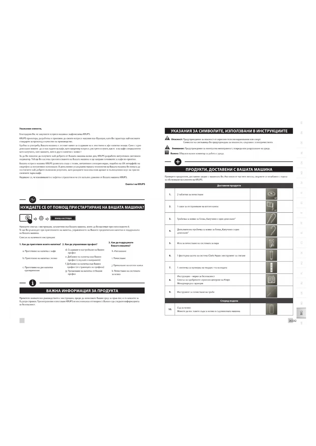c. Приготвяне на две напитки едновременно f. Добавяне на напитка към Вашия профил (от страницата на профила) j. Премахване на котлен камък g. Премахване на напитка от Вашия профилk. Почистване на системата за мляко ВАЖНА ИНФОРМАЦИЯ ЗА ПРОДУКТА Прочетете внимателно ръководството с инструкции, преди да използвате Вашия уред за пръв път, и го запазете за бъдещи справки. При неправилно използване KRUPS не носи никаква отговорност. Важно е да следвате информацията за безопасност. УКАЗАНИЯ ЗА СИМВОЛИТЕ, ИЗПОЛЗВАНИ В ИНСТРУКЦИИТЕ Опасност: Предупреждение за опасност от сериозни телесни наранявания или смърт. Символът на светкавица Ви предупреждава за опасности, свързани с електричеството. Внимание: Предупреждение за евентуална неизправност, повреда или разрушаване на уреда.