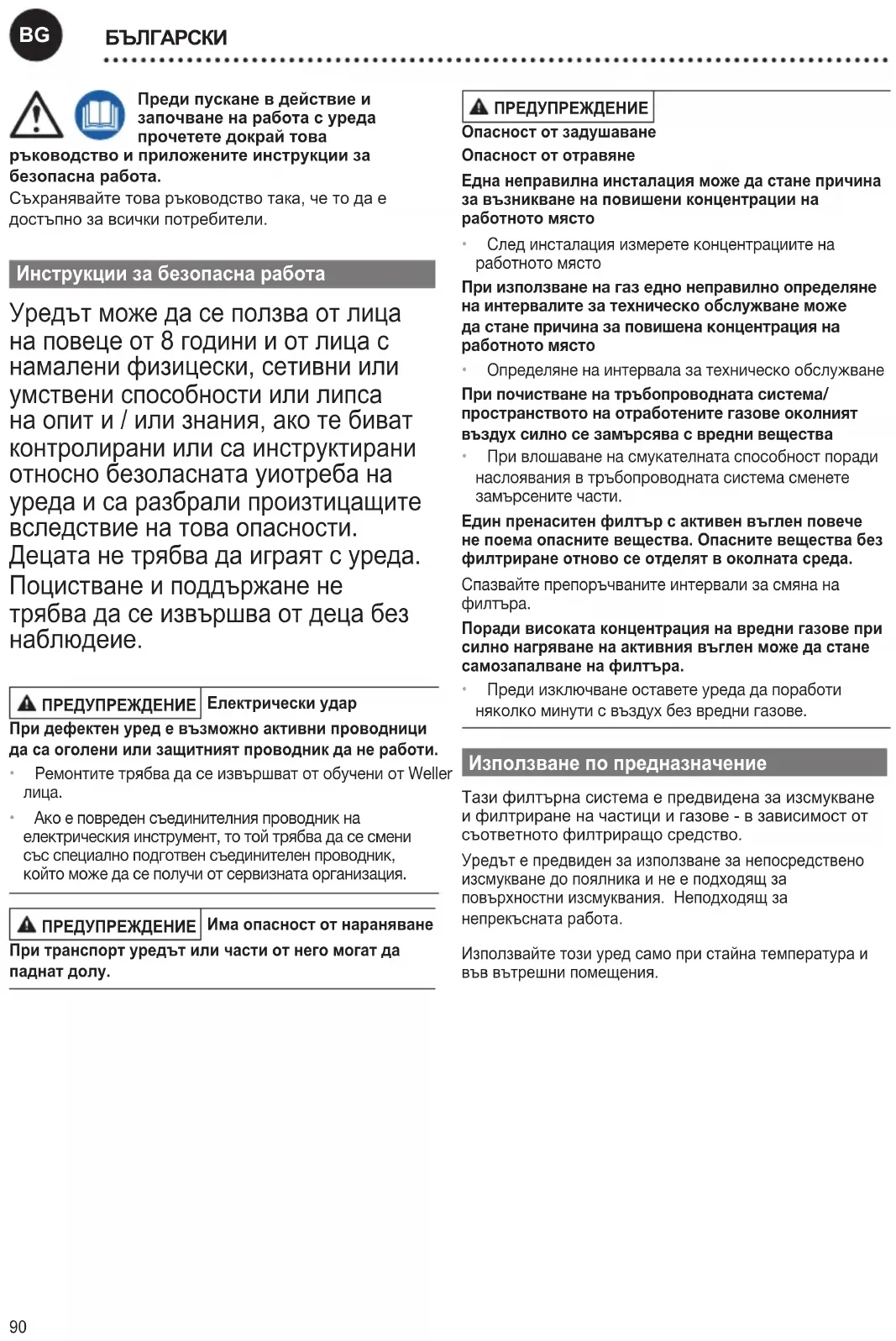 - Предиизключванеоставетеуредадапоработи няколкоминутисвъздухбезвреднигазове. Използване по предназначение Тази филтърна система е предвидена за изсмукване и филтриране на частици и газове - в зависимост от съответното филтриращо средство. Уредът е предвиден за използване за непосредствено изсмукване до поялника и не е подходящ за повърхностни изсмуквания. Неподходящ за непрекъсната работа. Използвайте този уред само при стайна температура и във вътрешни помещения.