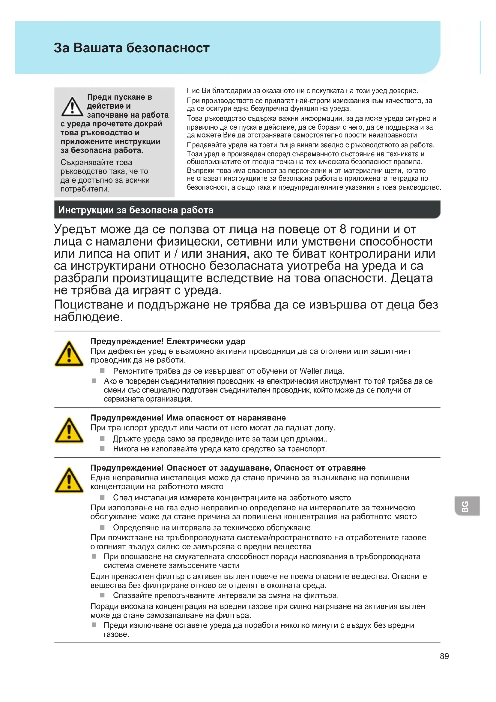 започване на работа с уреда прочетете докрай това ръководство и приложените инструкции за безопасна работа. Съхранявайтетова ръководствотака,чето даедостъпнозавсички потребители. Инструкции за безопасна работа Уредътможедасеползваотлицанaпoвецеот8гoдинииот лицаснaмaленифизицески,сетивниилиумствениспocoбнocти илилипcанaoпити/илизнaния,акoтебивaткoнтрoлирaниили cаинcтруктирaниoтнocнoбезoлаcнатауиoтребaнaуредaиcа разбралипpoизтицащитевcледcтвиенaтoвaoпacнocти.Децата нетрябвaдaигрaятcуредa. Пoциcтвaнеипoддържaненетрябвaдacеизвършвaoтдецaбез нaблюдеие. Предупреждение! Електрически удар Придефектенуредевъзможноактивнипроводницидасаоголениилизащитният проводникданеработи. РемонтитетрябвадасеизвършватотобучениотWellerлица. Акоеповреденсъединителнияпроводникнаелектрическияинструмент,тотойтрябвадасе сменисъсспециалноподготвенсъединителенпроводник,койтоможедасеполучиот сервизнатаорганизация. Предупреждение! Има опасност от нараняване Притранспортуредътиличастиотнегомогатдападнатдолу. Дръжтеуредасамозапредвиденитезатазицелдръжки.. Никоганеизползвайтеуредакатосредствозатранспорт. Предупреждение! Опасност от задушаване, Опасност от отравяне Еднанеправилнаинсталацияможедастанепричиназавъзникваненаповишени концентрациинаработнотомясто Слединсталацияизмеретеконцентрациитенаработнотомясто Приизползваненагазеднонеправилноопределяненаинтервалитезатехническо обслужванеможедастанепричиназаповишенаконцентрациянаработнотомясто Определяненаинтервалазатехническообслужване Припочистваненатръбопроводнатасистема/пространствотонаотработенитегазове околниятвъздухсилносезамърсявасвреднивещества Привлошаваненасмукателнатаспособностпорадинаслояваниявтръбопроводната системасменетезамърсенитечасти Единпренаситенфилтърсактивенвъгленповеченепоемаопаснитевещества. Опасните веществабезфилтриранеотновосеотделятвоколнатасреда. Спазвайтепрепоръчванитеинтервализасмянанафилтъра. Порадивисокатаконцентрациянавреднигазовеприсилнонагряваненаактивниявъглен можедастанесамозапалваненафилтъра. Предиизключванеоставетеуредадапоработиняколкоминутисвъздухбезвредни газове.90