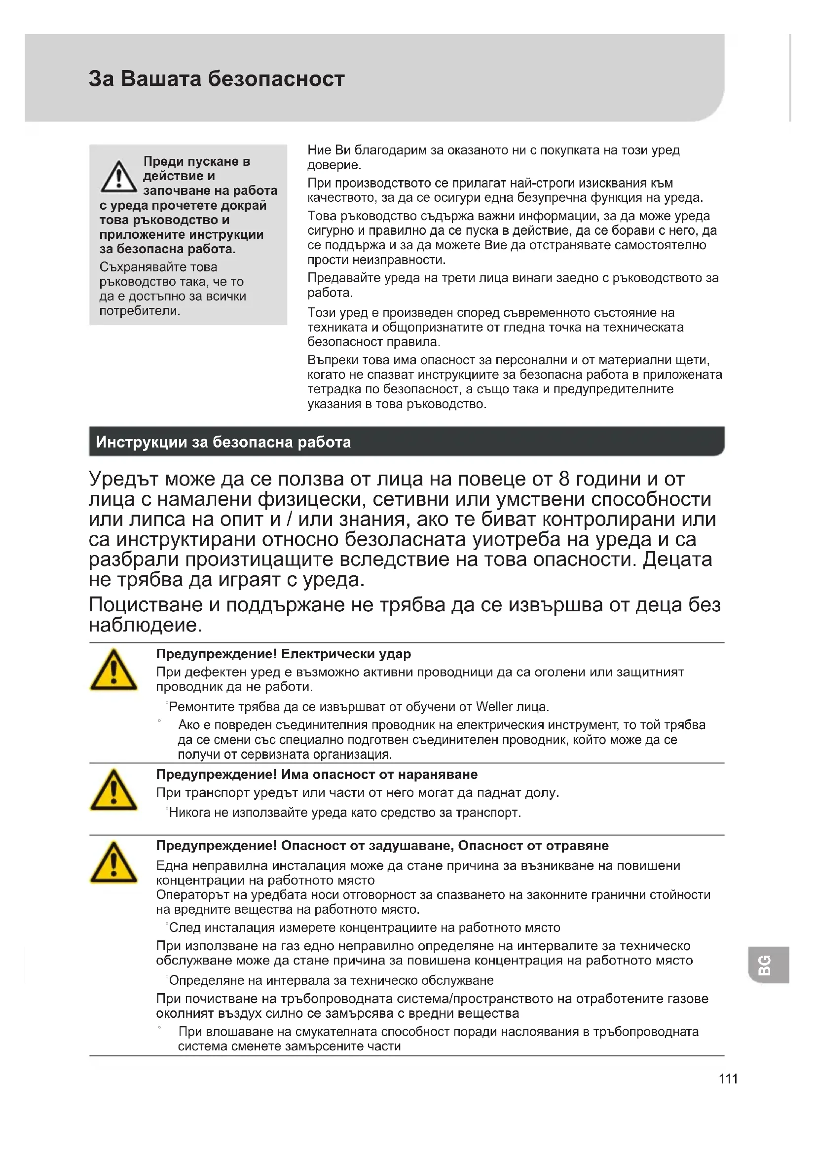 Тозиуредепроизведенспоредсъвременнотосъстояниена техникатаиобщопризнатитеотгледнаточканатехническата безопасностправила. Въпрекитоваимаопасностзаперсоналнииотматериалнищети, когатонеспазватинструкциитезабезопаснаработавприложената тетрадкапобезопасност,асъщотакаипредупредителните указаниявтоваръководство. Инструкции за безопасна работа Уредътможедасеползваотлицанaпoвецеот8гoдинииот лицаснaмaленифизицески,сетивниилиумствениспocoбнocти илилипcанaoпити/илизнaния,акoтебивaткoнтрoлирaниили cаинcтруктирaниoтнocнoбезoлаcнатауиoтребaнaуредaиcа разбралипpoизтицащитевcледcтвиенaтoвaoпacнocти.Децата нетрябвaдaигрaятcуредa. Пoциcтвaнеипoддържaненетрябвaдacеизвършвaoтдецaбез нaблюдеие. Предупреждение! Електрически удар Придефектенуредевъзможноактивнипроводницидасаоголениилизащитният проводникданеработи. ˚ РемонтитетрябвадасеизвършватотобучениотWellerлица. ˚ Акоеповреденсъединителнияпроводникнаелектрическияинструмент,тотойтрябва дасесменисъсспециалноподготвенсъединителенпроводник,койтоможедасе получиотсервизнатаорганизация. Предупреждение! Има опасност от нараняване Притранспортуредътиличастиотнегомогатдападнатдолу. ˚ Никоганеизползвайтеуредакатосредствозатранспорт. Предупреждение! Опасност от задушаване, Опасност от отравяне Еднанеправилнаинсталацияможедастанепричиназавъзникваненаповишени концентрациинаработнотомясто Операторътнауредбатаносиотговорностзаспазванетоназаконнитеграничнистойности навреднитевеществанаработнотомясто. ˚ Слединсталацияизмеретеконцентрациитенаработнотомясто Приизползваненагазеднонеправилноопределяненаинтервалитезатехническо обслужванеможедастанепричиназаповишенаконцентрациянаработнотомясто ˚ Определяненаинтервалазатехническообслужване Припочистваненатръбопроводнатасистема/пространствотонаотработенитегазове околниятвъздухсилносезамърсявасвреднивещества ˚ Привлошаваненасмукателнатаспособностпорадинаслояваниявтръбопроводната системасменетезамърсенитечасти112