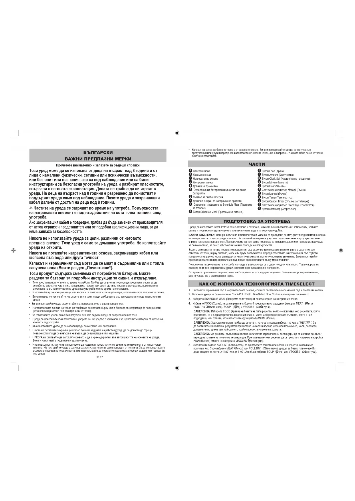 за бавно готвене и сотиране, махнете всички опаковъчни компоненти, измийте капака и подвижния съд за готвене с топла сапунена вода и ги подсушете добре. ВАЖНИ ЗАБЕЛЕЖКИ: Повърхностите на някои плотове и маси не са пригодени да издържат продължително време на генерираната от някои уреди топлина. Не поставяйте нагретия уред или съда за готвене върху чувствителни спрямо топлината повърхности.Препоръчваме да поставяте подложка за горещи съдове или триножник под уреда за бавно готвене, за да се избегнат възможни повреди на повърхността. Бъдете внимателни, когато поставяте керамичния съд върху печки с керамични котлони или върху плот със стъклени котлони, върху плотове, маси или други повърхности. Поради естеството на керамичния съд грубата повърхност на дъното може да надраска някои повърхности, ако не се проявява внимание. Винаги поставяйте предпазна подложка под керамичния съд, преди да го поставите върху маса или плот. По време на първоначалната употреба на уреда е възможно да се отдели лек дим или мирис. Това е нормално явление за много нагревателни уреди, което изчезва след няколко ползвания. Отстранете оранжевата защитна лента на батерията, като я издърпате цялата. Това ще контролира часовника, когато уредът не е включен в контакта. КАК СЕ ИЗПОЛЗВА ТЕХНОЛОГИЯТА TIMESELECT