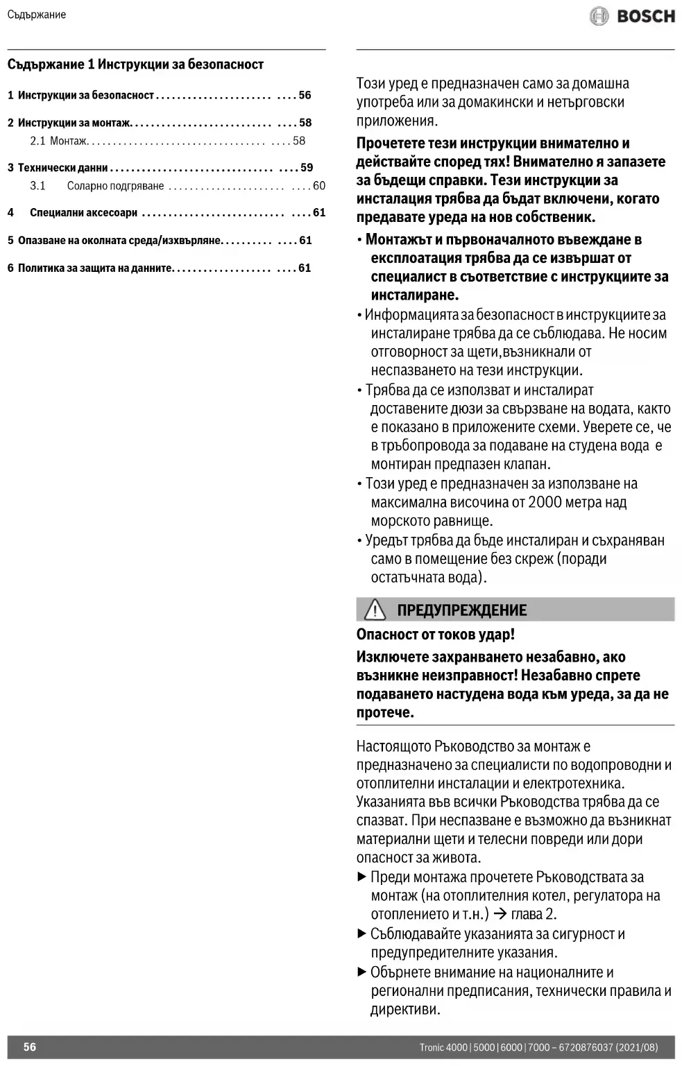 - Не използвайте парочистачка. Сигурност на електрическите уреди за битова употреба и подобни цели За предотвратяване на опасности от електрически уреди в съответствие с EN 60335-2-35 са валидни следните изисквания: «Този уред може да се използва от деца на възраст над 3 години, както и от лица с ограничени физически, сетивни или умствени способности или без опит и познания само ако те под наблюдение и са били инструктирани относно безопасното използване на уреда и разбират рисковете от това. Децата не трябва да играят с уреда. Почистването и обслужването не трябва да се извършват от деца без надзор.» «Ако проводникът за свързване към захранването е повреден, той трябва да бъде подменен от производителя или от негов сервизен представител, или от лице със съответната квалификация, за да се предотврати опасността.»Инструкции за монтаж Tronic 4000 | 5000 | 6000 | 7000 – 6720876037 (2021/08)
