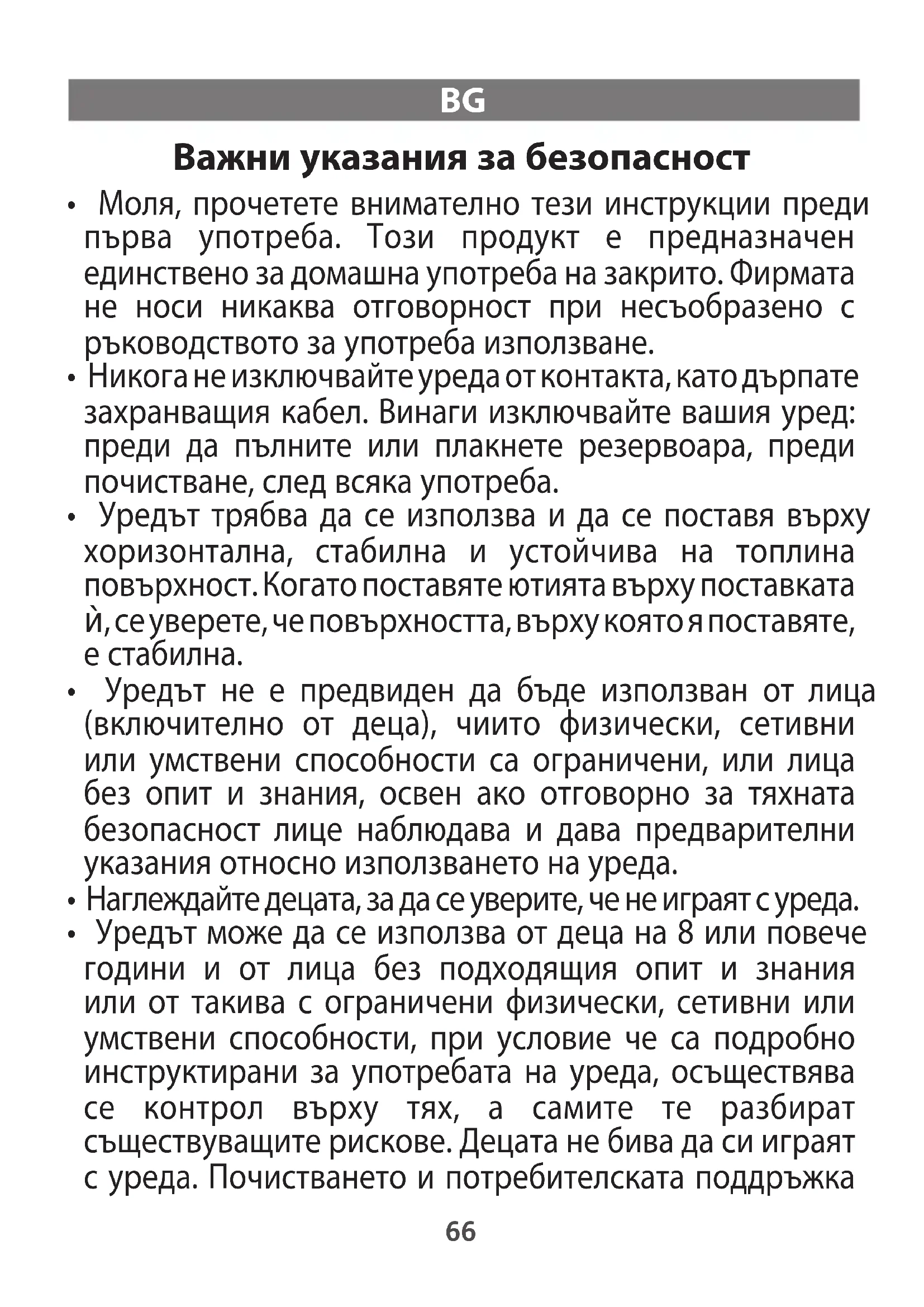 - Уредът може да се използва от деца на 8 или повече години и от лица без подходящия опит и знания или от такива с ограничени физически, сетивни или умствени способности, при условие че са подробно инструктирани за употребата на уреда, осъществява се контрол върху тях, а самите те разбират съществуващите рискове. Децата не бива да си играят с уреда. Почистването и потребителската поддръжка 66не бива да се извършват от деца без надзор. Дръжте ютията и нейния кабел далече от деца под 8-годишна възраст, когато тя е включена или докато изстива.