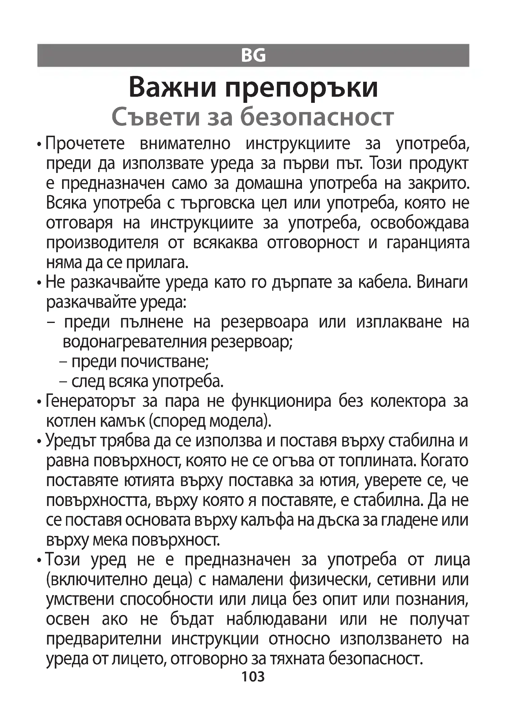 - Този уред не е предназначен за употреба от лица (включително деца) с намалени физически, сетивни или умствени способности или лица без опит или познания, освен ако не бъдат наблюдавани или не получат предварителни инструкции относно използването на уреда от лицето, отговорно за тяхната безопасност.104