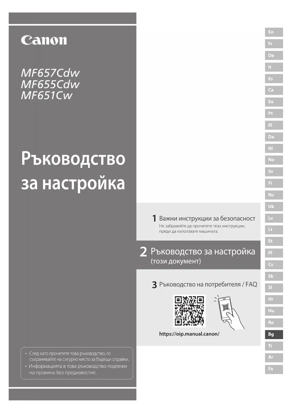 След като прочетете това ръководство, го съхранявайте на сигурно място за бъдещи справки.• Информацията в това ръководство подлежи на промяна без предизвестие.https://oip.manual.canon/ Важни инструкции за безопасностНе забравяйте да прочетете тези инструкции, преди да използвате машината. Ръководство на потребителя / FAQ
