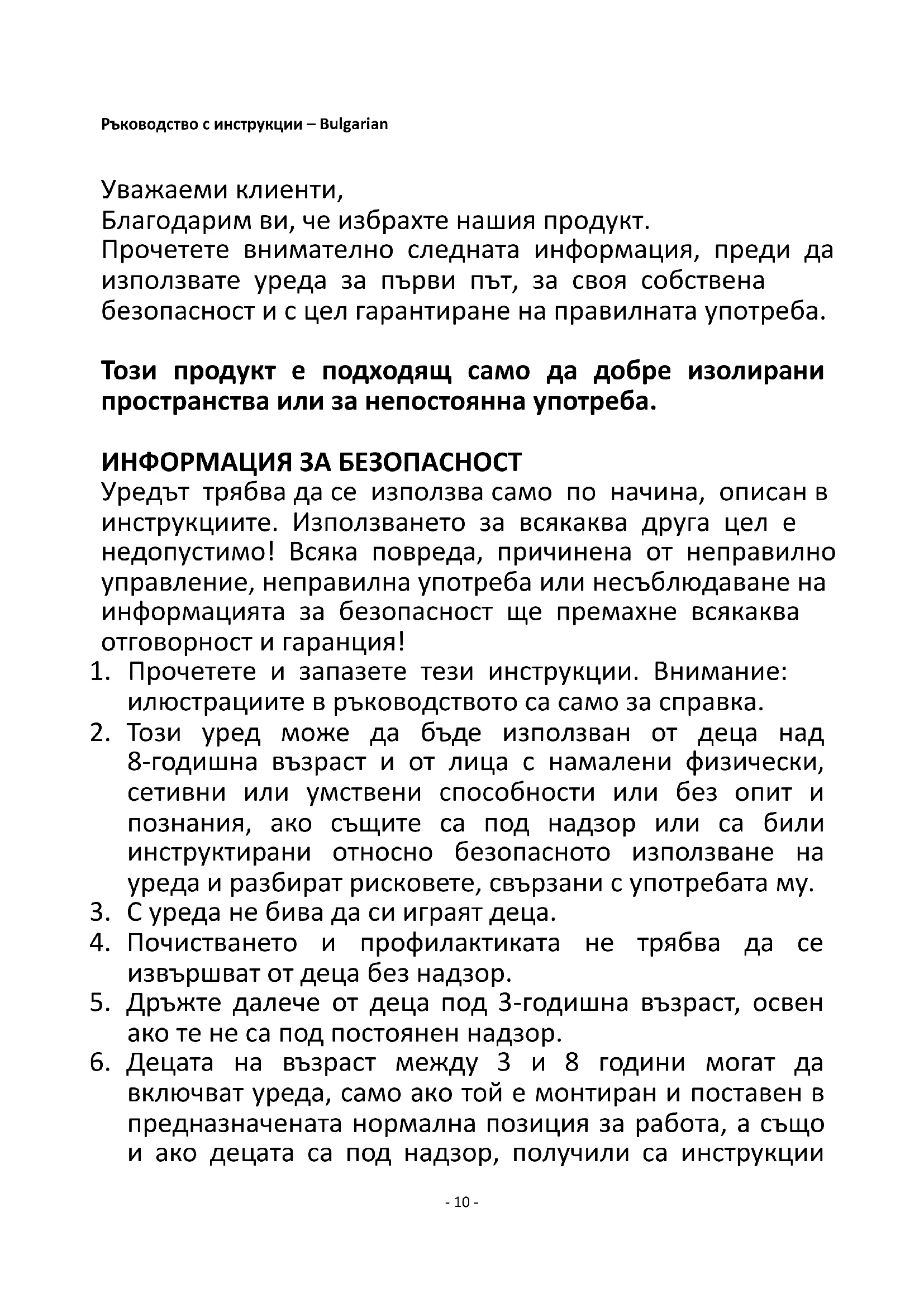 включват уреда, само ако той е монтиран и поставен в предназначената нормална позиция за работа, а също и ако децата са под надзор, получили са инструкции- 11 - относно използването на уреда по безопасен начин и разбират евентуалните опасности. Децата на възраст между 3 и 8 години не трябва да включват в захранването, да регулират, да почистват и да извършват дейности по поддръжка на уреда.