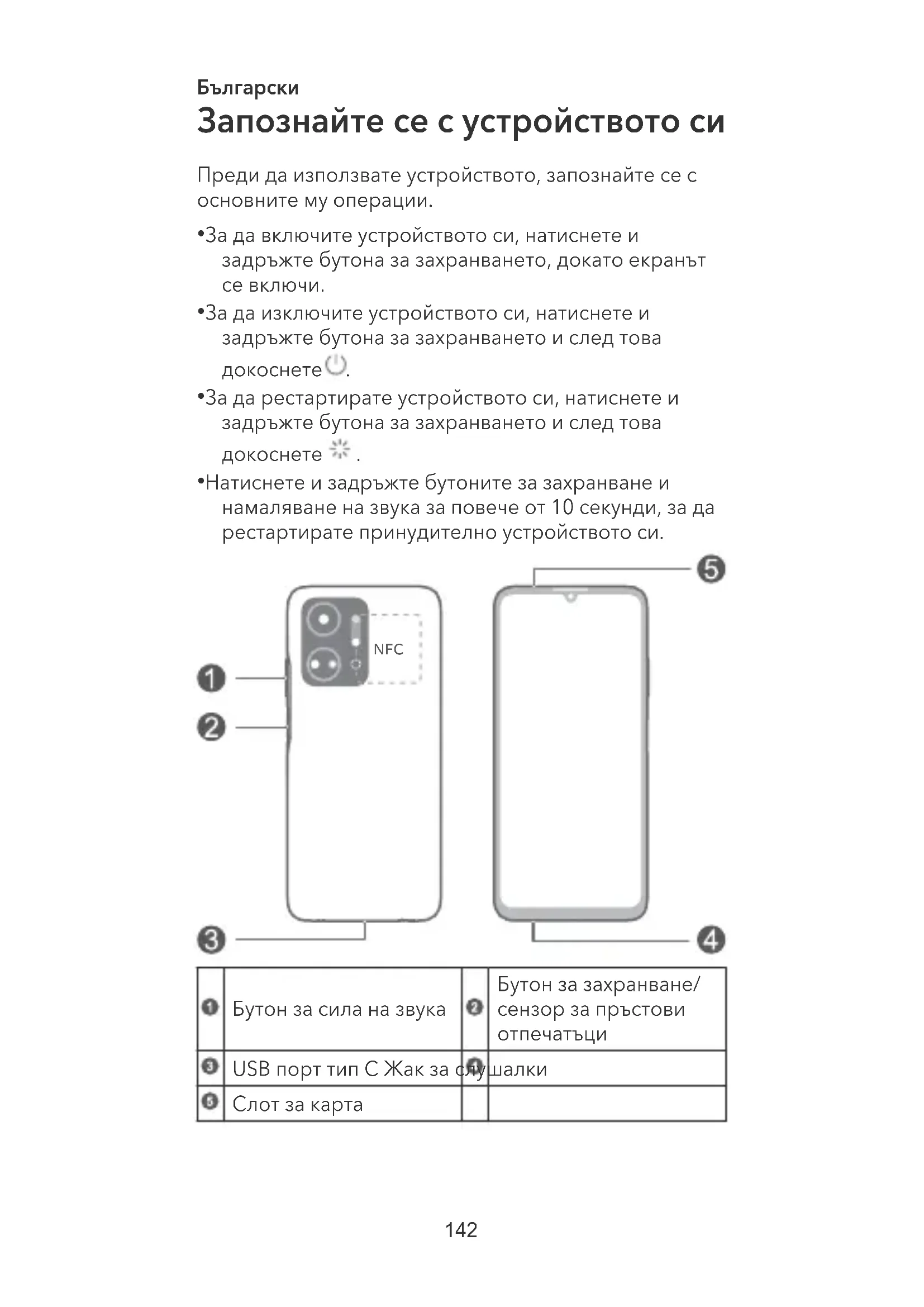 USB порт тип C Жак за слушалки Слот за карта 142• Имайте предвид, че зоната за NFC трябва да е в близост до други устройства или обекти при използване на функцията за NFC.