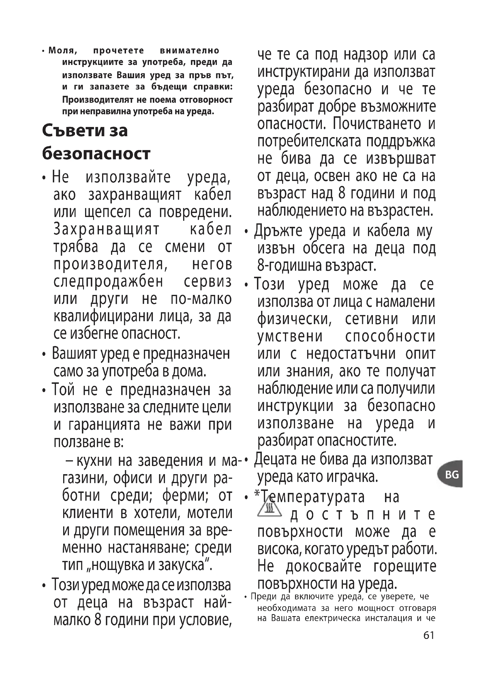 - Моля, прочетете внимателно инструкциите за употреба, преди да използвате Вашия уред за пръв път, и ги запазете за бъдещи справки: Производителят не поема отговорност при неправилна употреба на уреда.