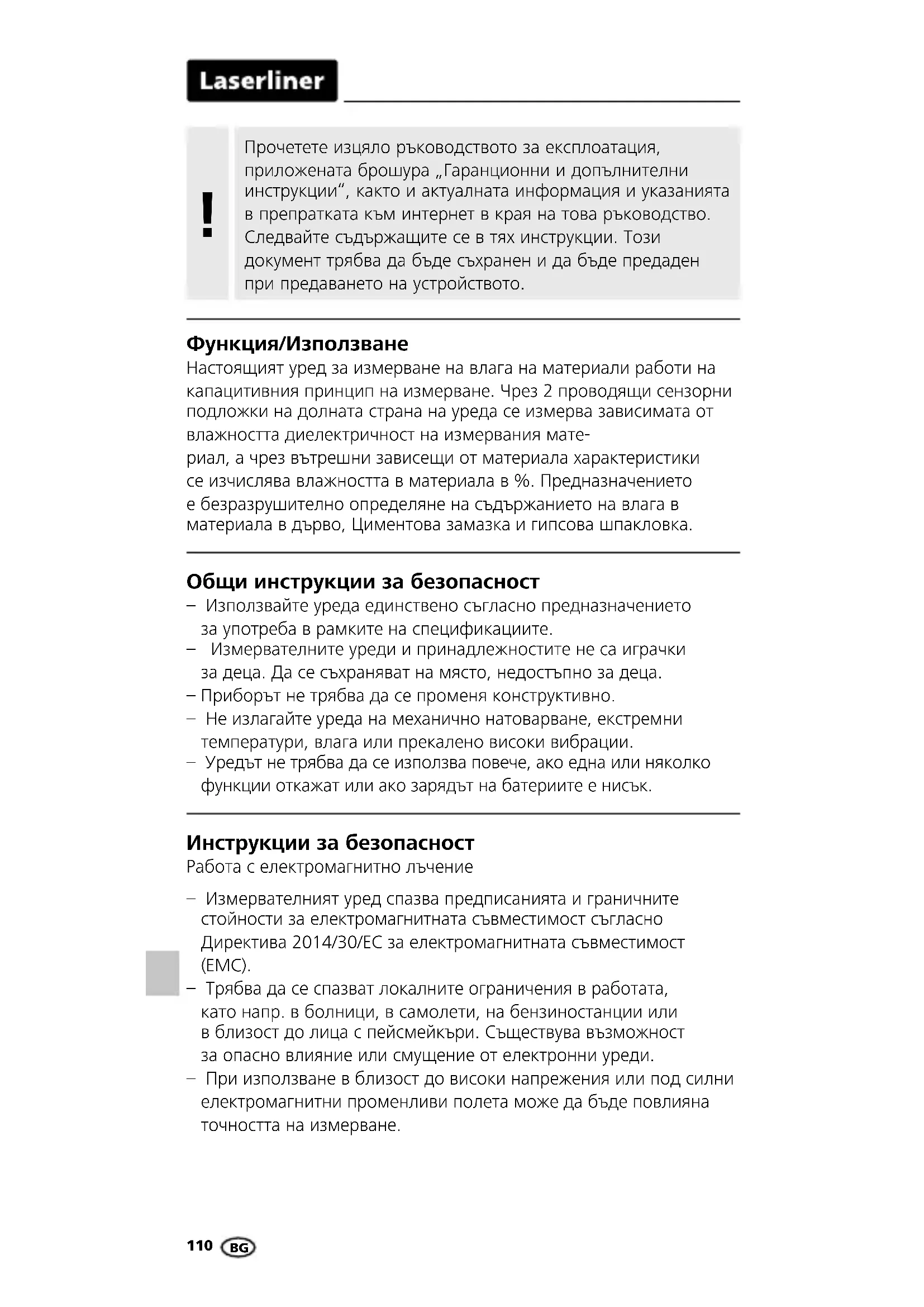 РЪКОВОДСТВО ЗА ПОТРЕБИТЕЛЯ MoistureFinder Compact Laserliner