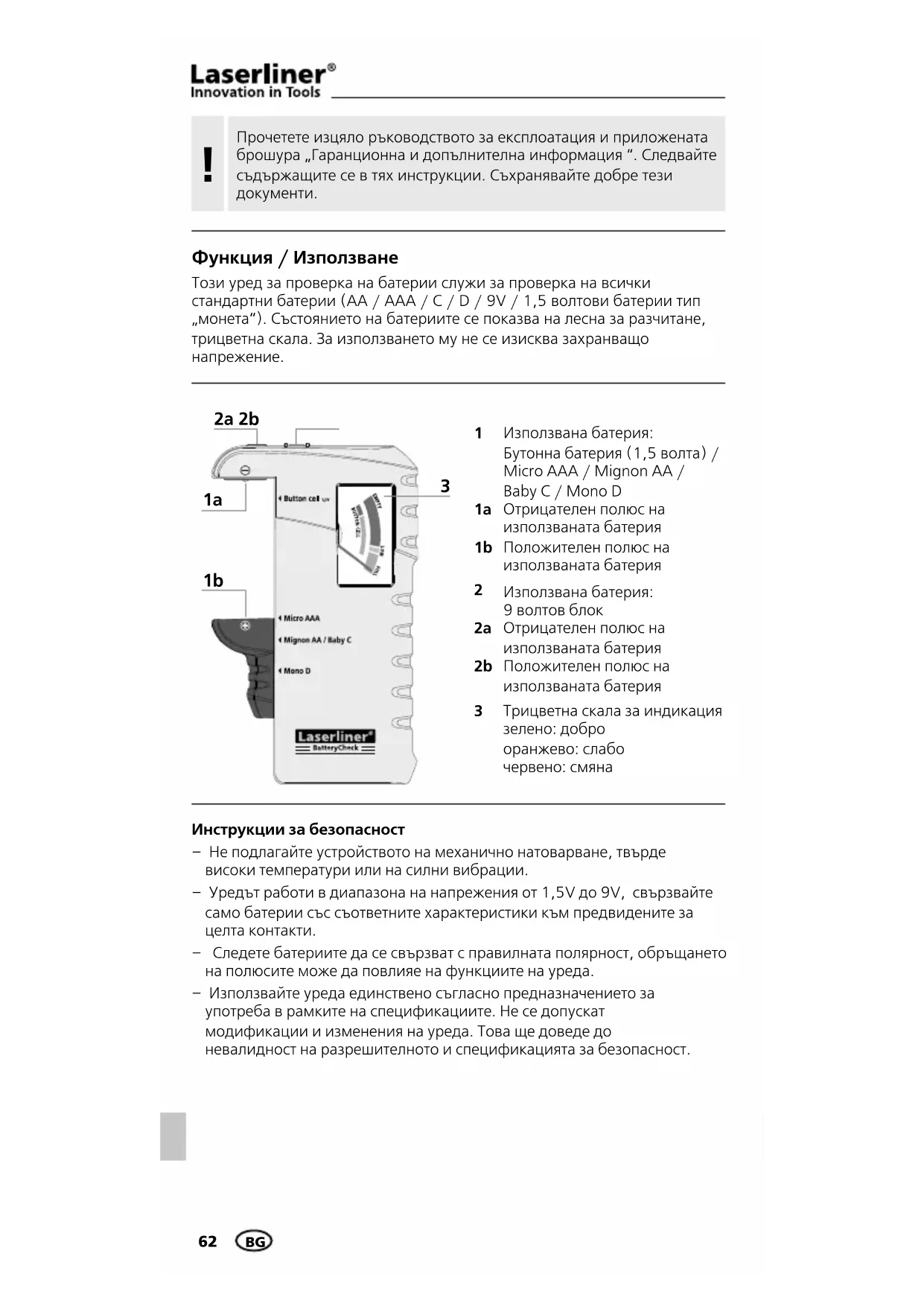 РЪКОВОДСТВО ЗА ПОТРЕБИТЕЛЯ BatteryCheck Laserliner