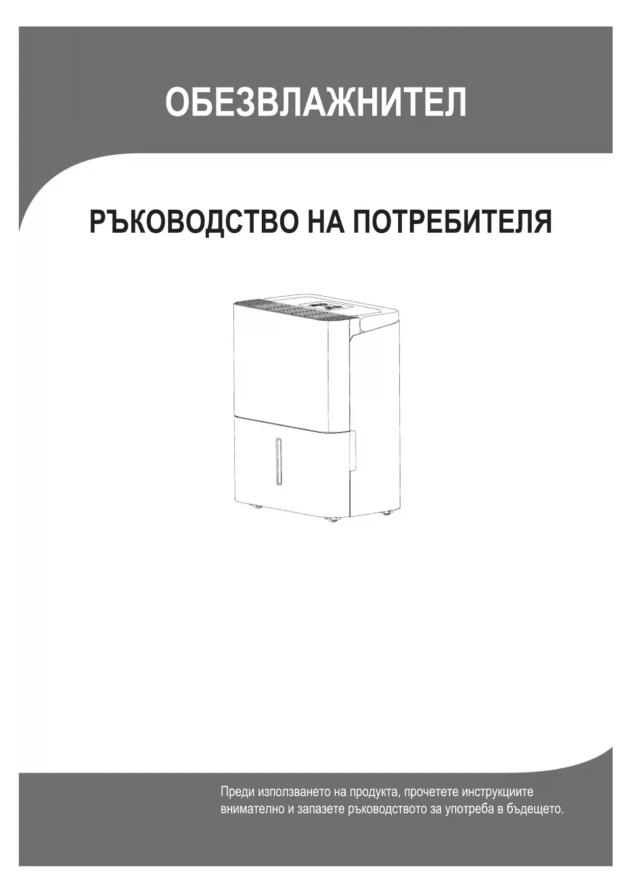 ● Ikke tillatt tilstrekkelig tid til å fjerne luftfuktighet. ● Sørg for at det ikke er gardiner eller møbler som blokkerer baksiden av avfukteren. ● Fuktighetsinnstillingen er ikke stilt inn lavt nok. ● Sjekk at alle dører, vinduer og andre åpninger er lukket. ● Romtemperatur er for lav, under 5°C(41°F). ● Parafinlampe eller annet apparat genererer vanndamp i rommet. Enheten starter ikkeDesign og spesifikasjoner kan endres uten forvarsel for å forbedre produktet. Kontakt forhandler eller produsent for detaljer. Eventuelle oppdateringer vil bli lastet opp til service-nettsiden, vennligst se etter siste versjon.ОБЕЗВЛАЖНИТЕЛ РЪКОВОДСТВО НА ПОТРЕБИТЕЛЯ Преди използването на продукта, прочетете инструкциите внимателно и запазете ръководството за употреба в бъдещето.СОЦИАЛНА ЗАБЕЛЕЖКА Когато използвате този продукт в европейските страни трябва да се спазва следната информация: ИЗХВЪРЛЯНЕ: Не изхвърляйте този продукт като несортиран общ отпадък. Отделно събиране на такива отпадъци за специална обработка е необходимо. Забранява се изхвърлянето на този уред заедно с битови отпадъци. Има няколко възможности за изхвърляне: А) Създадени са системи за събиране, при които електрониката за скрап да бъде унищожена без да е нужно потребителя да заплаща такса. Б) Когато купите нов продукт, търговецът, от който го закупувате ще приеме стария продукт без такса за вас. В) Производителят ще вземе старият уред за рециклиране безплатно. Г) Тъй като старите продукти съдържат ценни ресурси, те могат да бъдат предадени в депа