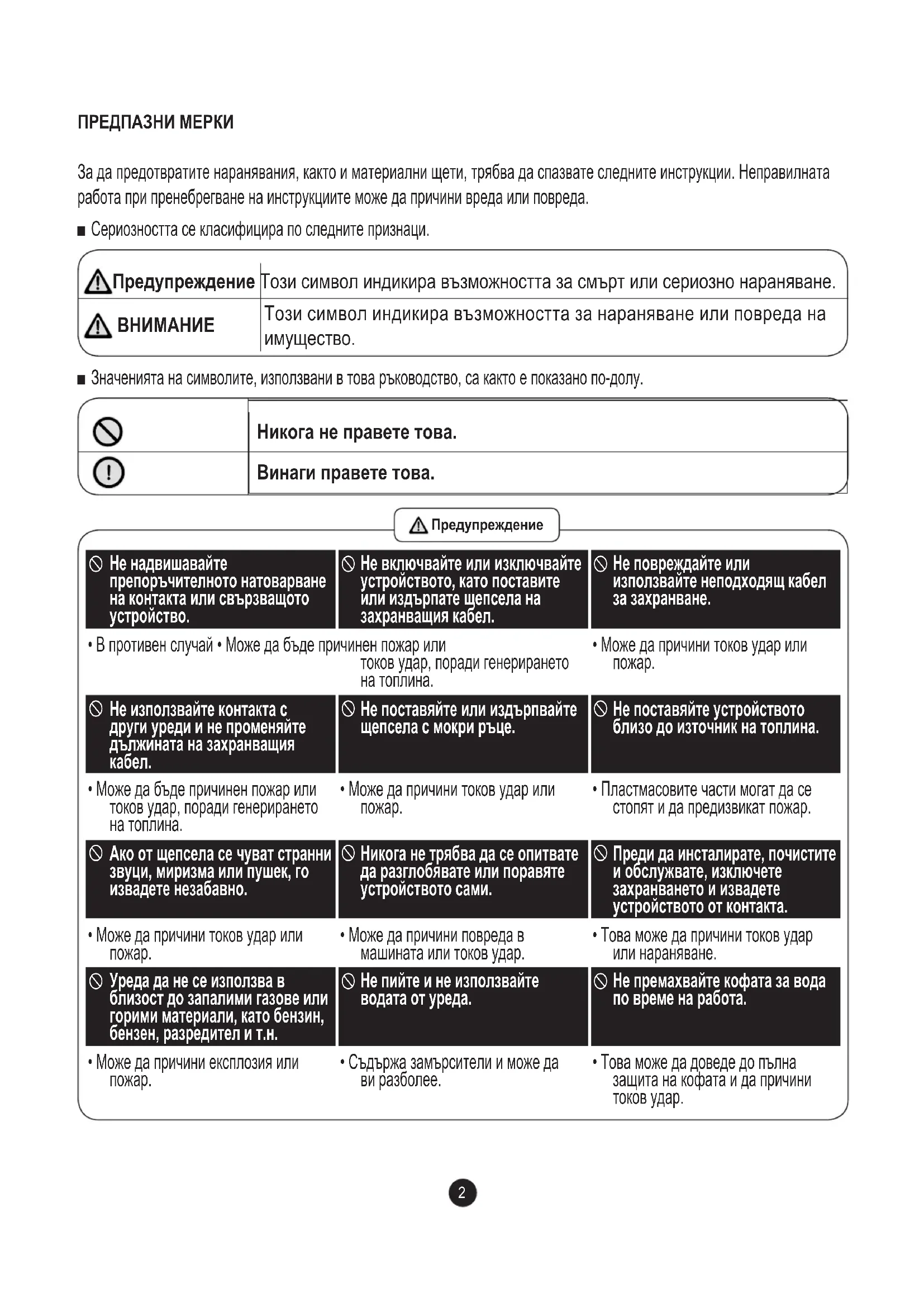 ■ Значенията на символите, използвани в това ръководство, са както е показано по-долу. Никога не правете това. Винаги правете това.