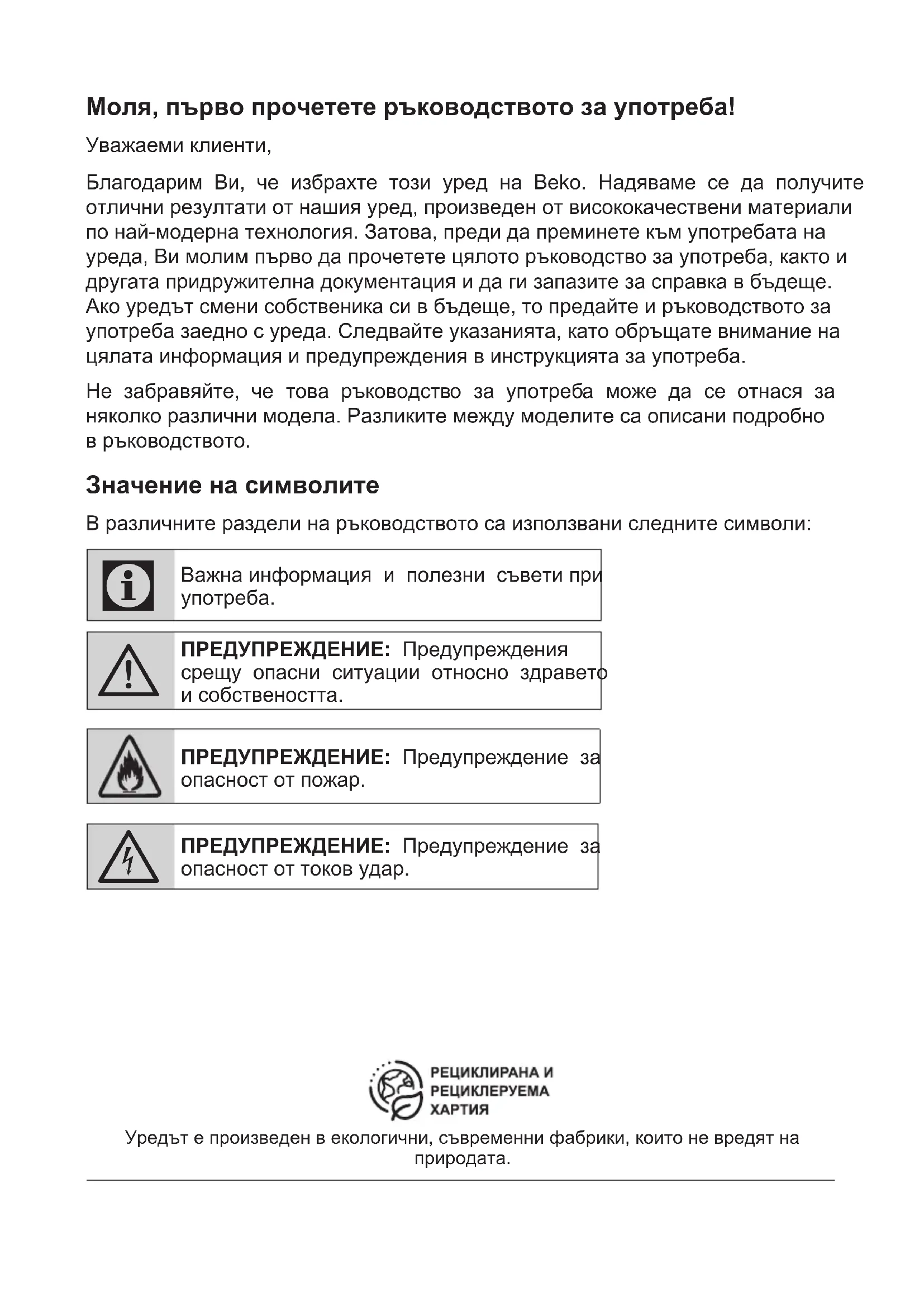 - Продуктите Beko съ- ответстват на прило- жимите стандарти за безопасност; ето защо, в случай на повреда по уреда или захранващия кабел, той трябва да бъде ремонтиран или сменен от дилър, сер- визен център или спе- циалист и оторизиран сервиз с цел избягване на всякакви опасности. Погрешен или неквали- фициран ремонт може да доведе до опасност и риск за потребителя.