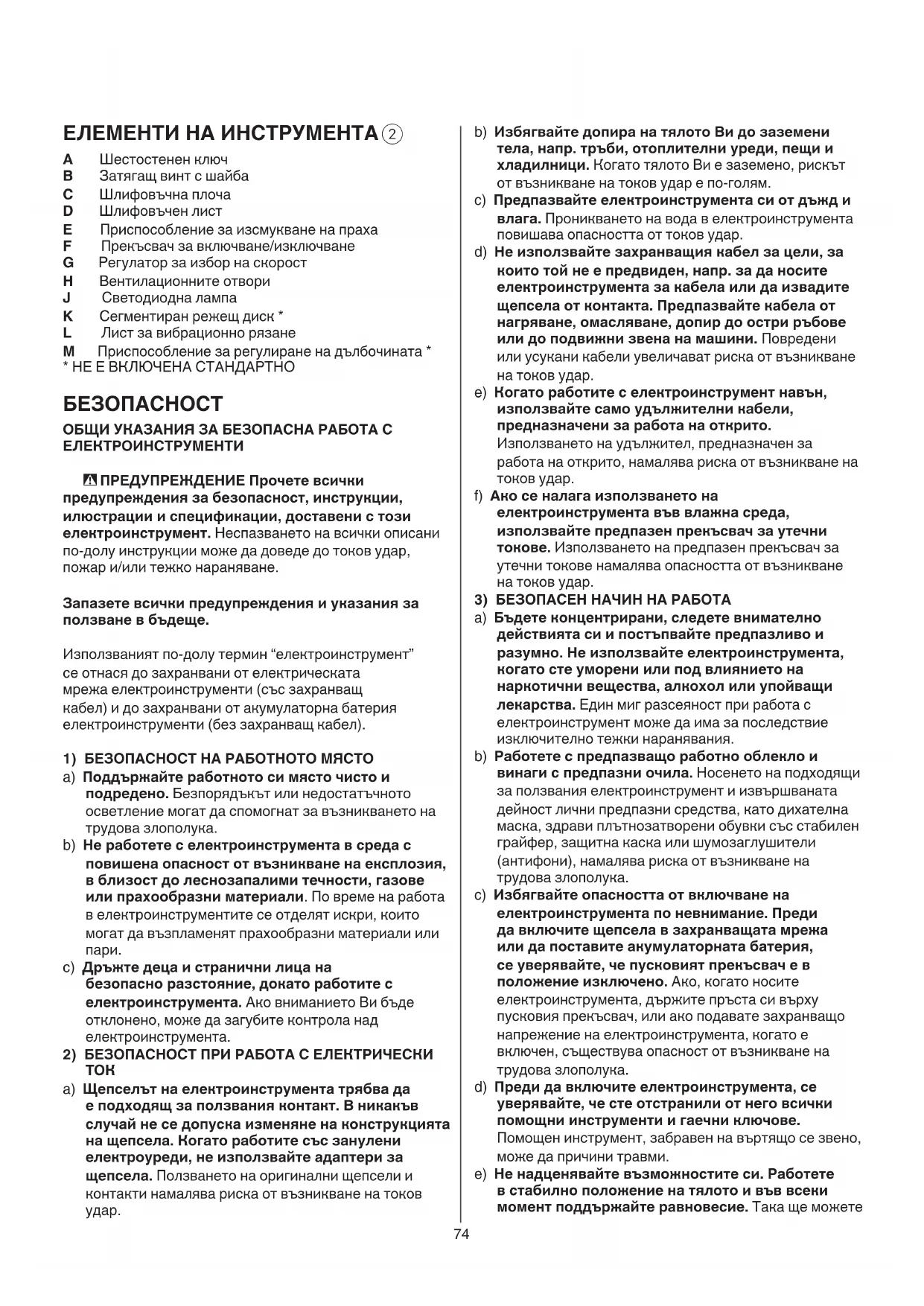 A Шестостенен ключ B Затягащ винт с шайба C Шлифовъчна плоча D Шлифовъчен лист E Приспособление за изсмукване на праха F Прекъсвач за включване/изключване G Регулатор за избор на скорост H Вентилационните отвоpи J Светодиодна лампа K Сегментиран режещ диск * L Лист за вибрационно рязане M Приспособление за регулиране на дълбочината *