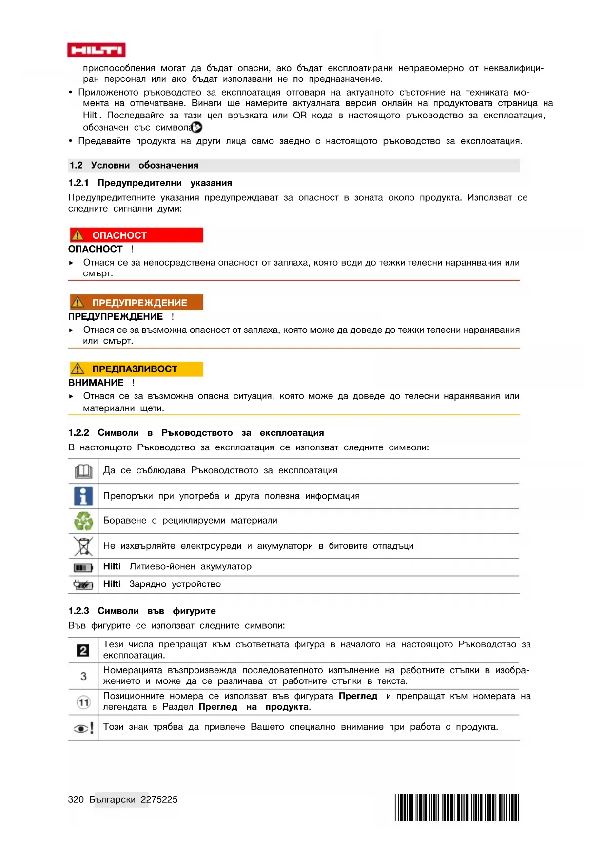 В настоящото Ръководство за експлоатация се използват следните символи: Да се съблюдава Ръководството за експлоатация Препоръки при употреба и друга полезна информация Боравене с рециклируеми материали Не изхвърляйте електроуреди и акумулатори в битовите отпадъци Hilti Литиево-йонен акумулатор Hilti Зарядно устройство