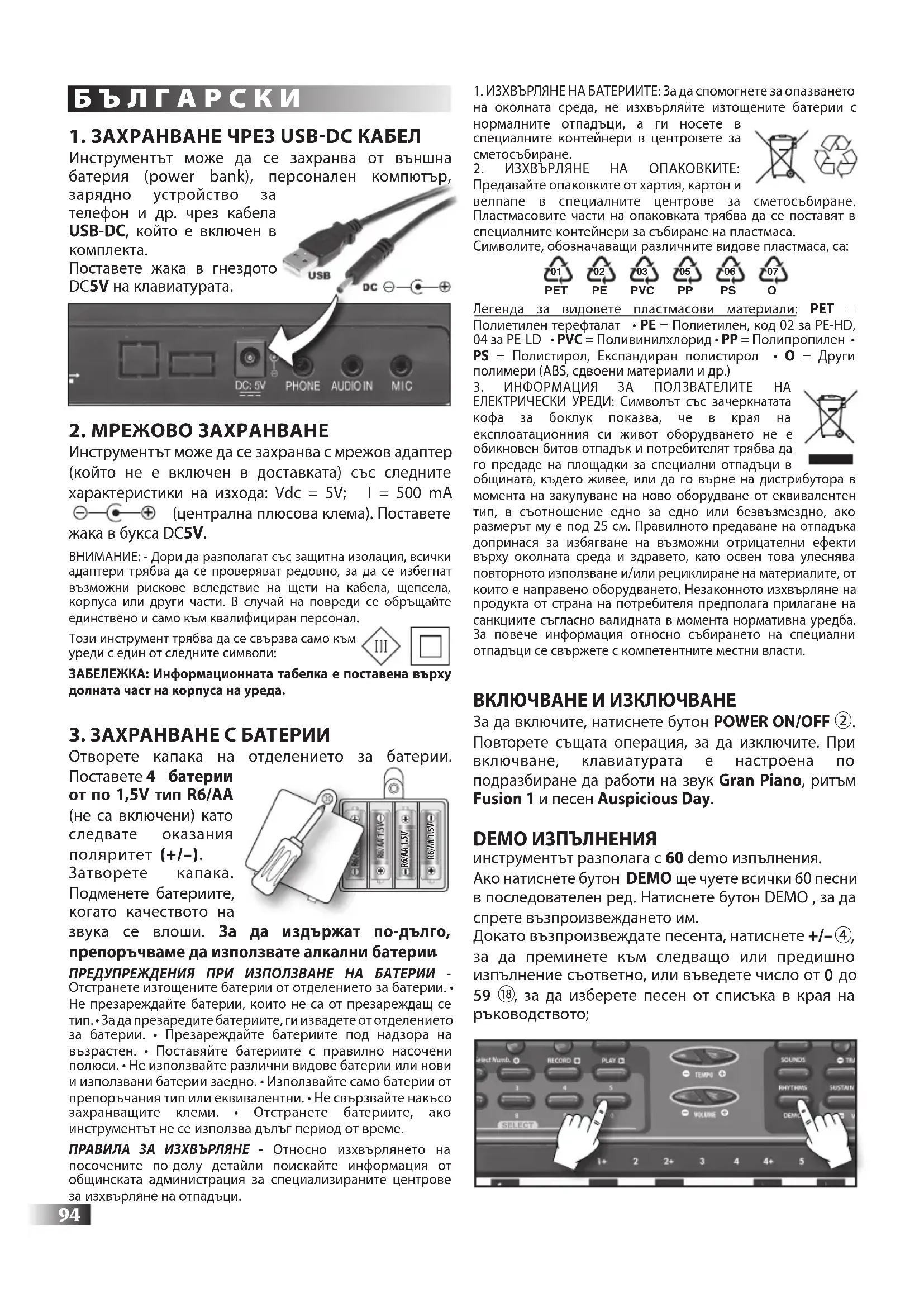 ЕЛЕКТРИЧЕСКИ УРЕДИ: Символът със зачеркнатата кофа за боклук показва, че в края на експлоатационния си живот оборудването не е обикновен битов отпадък и потребителят трябва да го предаде на площадки за специални отпадъци в общината, където живее, или да го върне на дистрибутора в момента на закупуване на ново оборудване от еквивалентен тип, в съотношение едно за едно или безвъзмездно, ако размерът му е под 25 см. Правилното предаване на отпадъка допринася за избягване на възможни отрицателни ефекти върху околната среда и здравето, като освен това улеснява повторното използване и/или рециклиране на материалите, от които е направено оборудването. Незаконното изхвърляне на продукта от страна на потребителя предполага прилагане на санкциите съгласно валидната в момента нормативна уредба. За повече информация относно събирането на специални отпадъци се свържете с компетентните местни власти. BЮ Ю За да включите, натиснете бутон POWER ON/OFF ②. Повторете същата операция, за да изключите. При включване, клавиатурата е настроена по подразбиране да работи на звук Gran Piano, ритъм Fusion 1 и песен Auspicious Day. DEMO ПЪЯ инструментът разполага с 60 demo изпълнения. Ако натиснете бутон DEMO ще чуете всички 60 песни в последователен ред. Натиснете бутон DEMO , за да спрете възпроизвеждането им. Докато възпроизвеждате песента, натиснете +/–