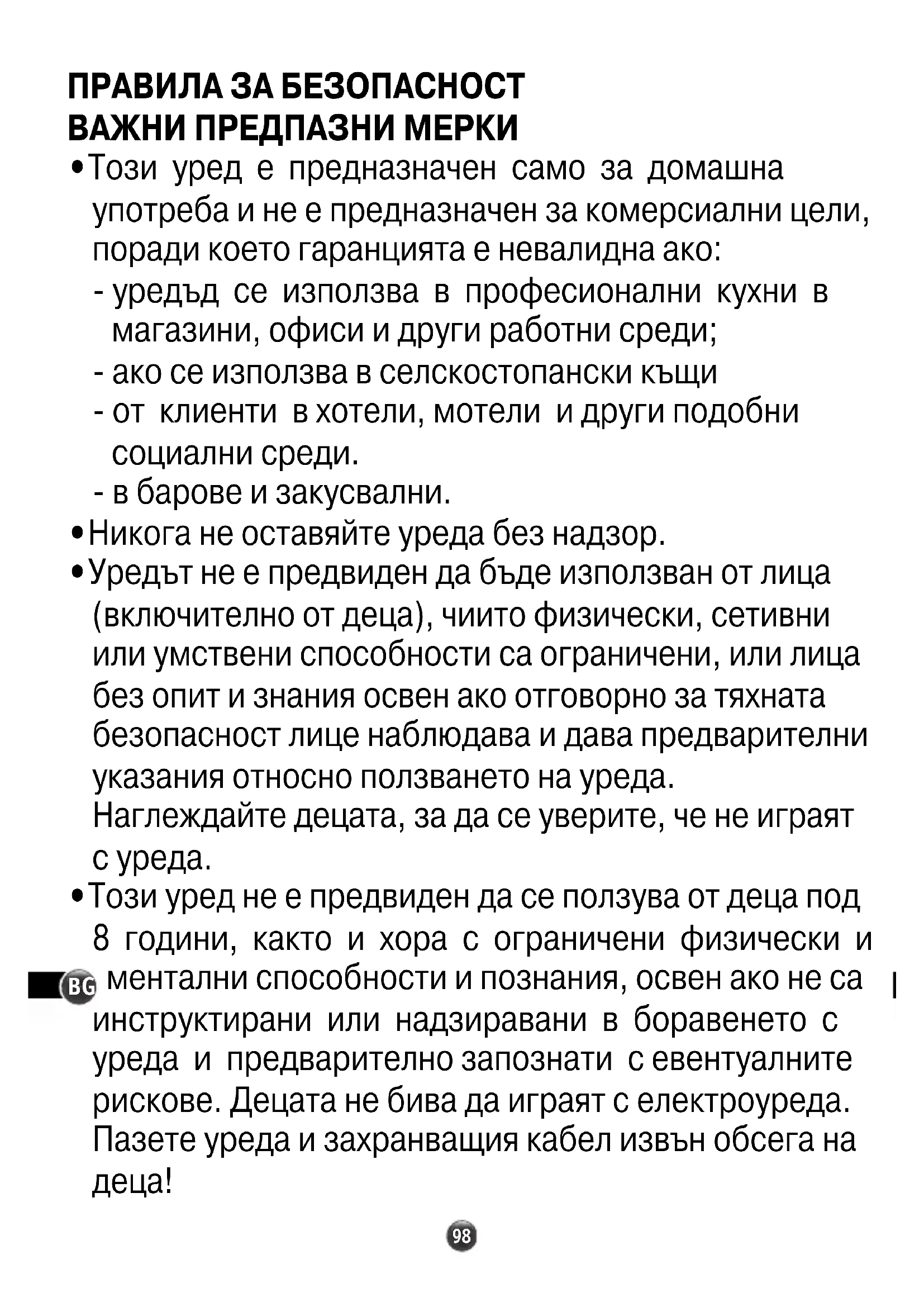 - Този уред е предназначен само за домашна употреба и не е предназначен за комерсиални цели, поради което гаранцията е невалидна ако: - уредъд се използва в професионални кухни в магазини, офиси и други работни среди; - ако се използва в селскостопански къщи - от клиенти в хотели, мотели и други подобни социални среди. - в барове и закусвални.