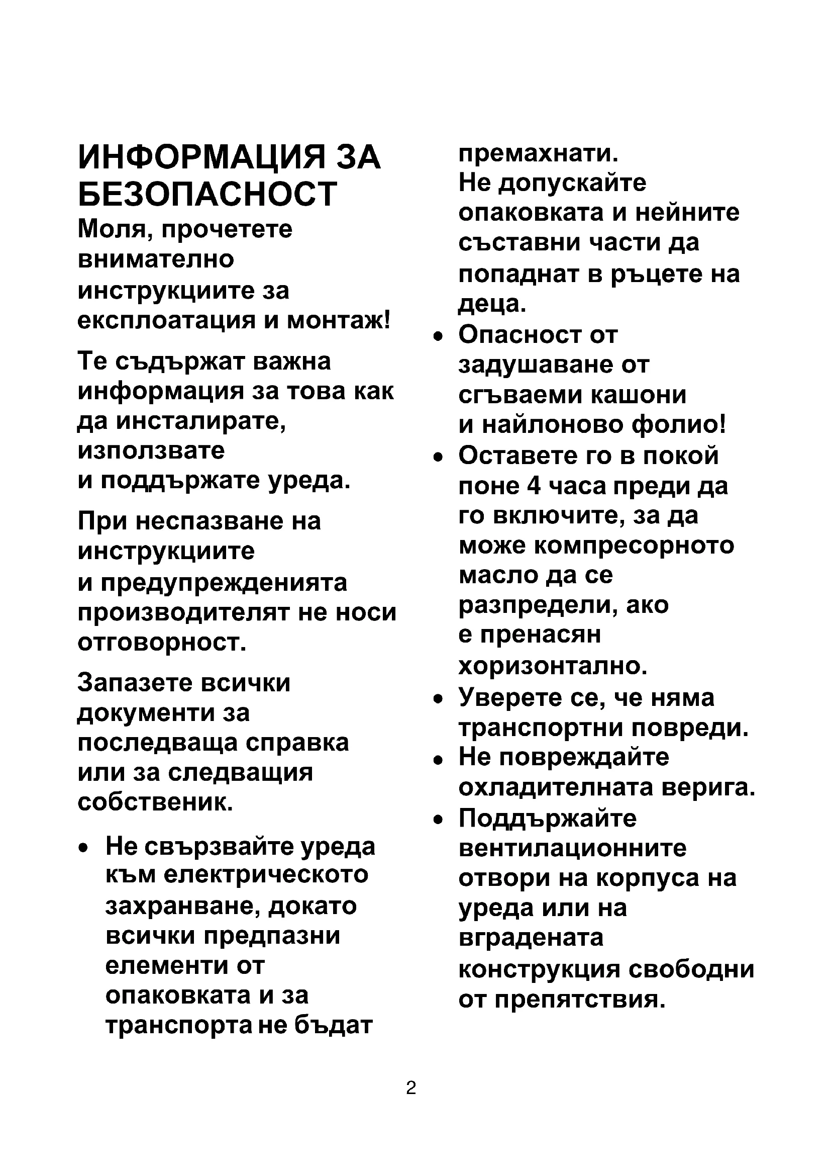 Оставете го в покой поне 4 часа преди да го включите, за да може компресорното масло да се разпредели, ако