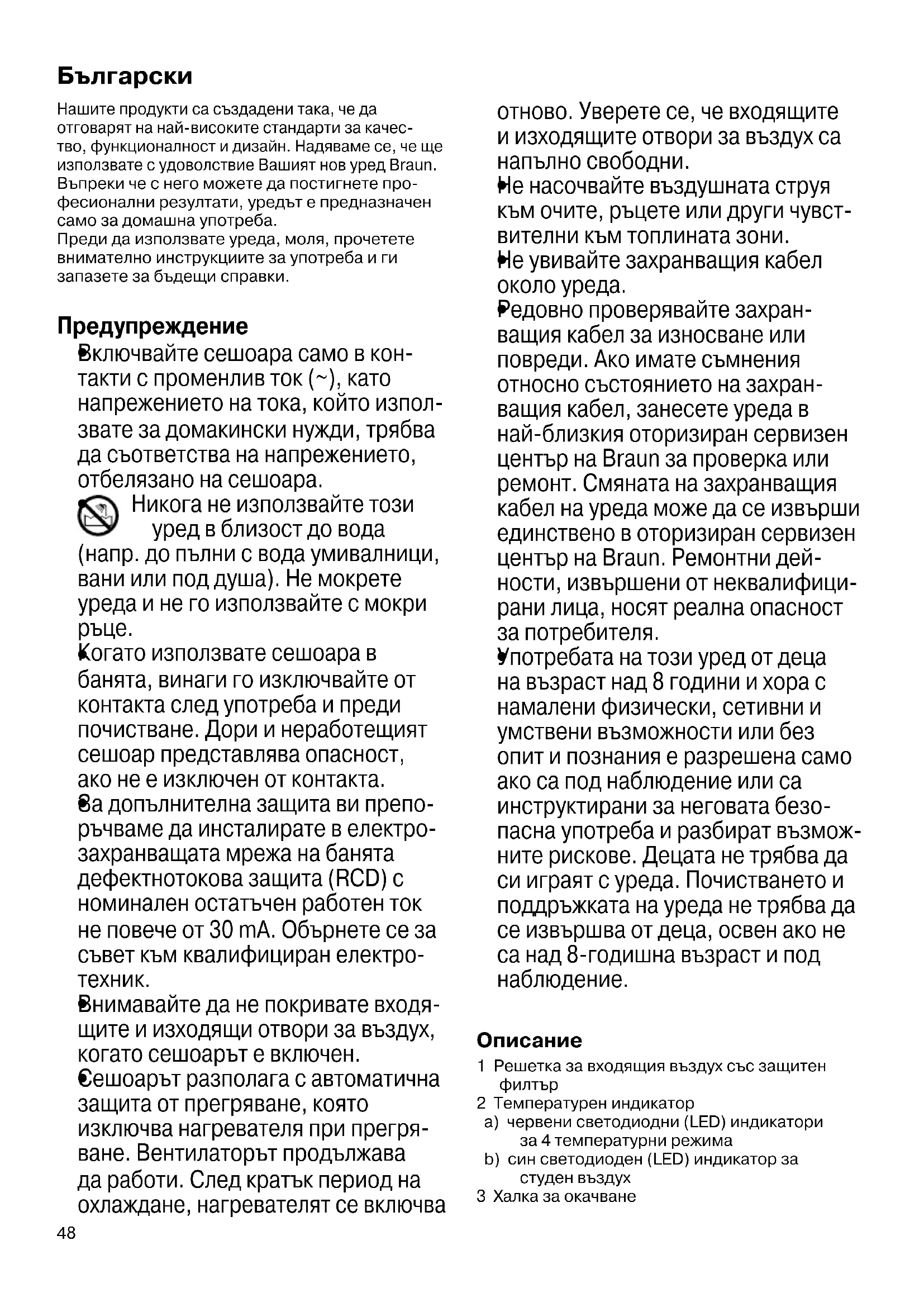Нашите продукти са създадени така, че да отговарят на най-високите стандарти за качес- тво, функционалност и дизайн. Надяваме се, че ще използвате с удоволствие Вашият нов уред Braun. Въпреки че с него можете да постигнете про- фесионални резултати, уредът е предназначен само за домашна употреба. Преди да използвате уреда, моля, прочетете внимателно инструкциите за употреба и ги запазете за бъдещи справки. Предупреждение