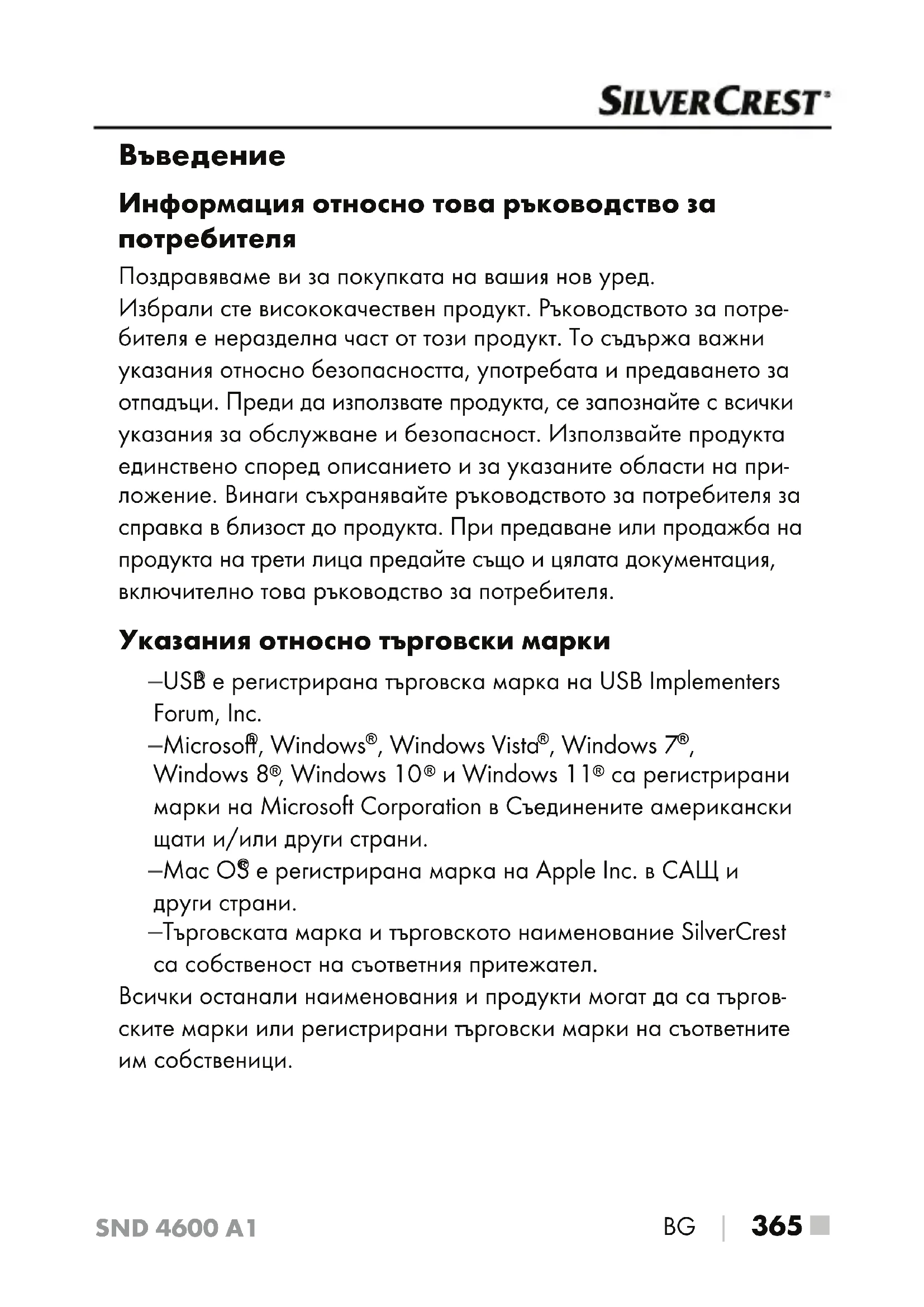 РЪКОВОДСТВО ЗА ПОТРЕБИТЕЛЯ SND 4600 A1 SILVERCREST