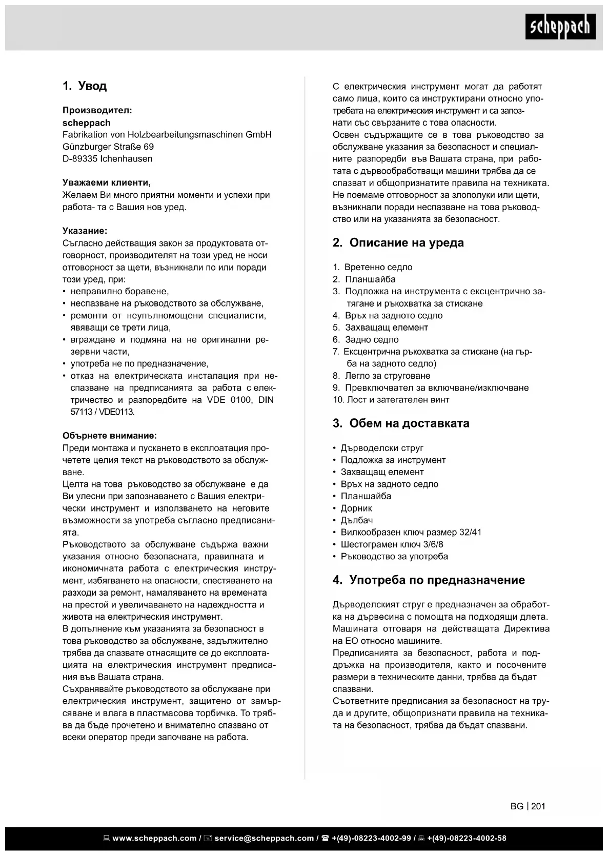 Ръководството за обслужване съдържа важни указания относно безопасната, правилната и икономичната работа с електрическия инстру- мент, избягването на опасности, спестяването на разходи за ремонт, намаляването на времената на престой и увеличаването на надеждността и живота на електрическия инструмент. В допълнение към указанията за безопасност в това ръководство за обслужване, задължително трябва да спазвате отнасящите се до експлоата- цията на електрическия инструмент предписа- ния във Вашата страна. Съхранявайте ръководството за обслужване при електрическия инструмент, защитено от замър- сяване и влага в пластмасова торбичка. То тряб- ва да бъде прочетено и внимателно спазвано от всеки оператор преди започване на работа. www.scheppach.com / service@scheppach.com / +(49)-08223-4002-99 / +(49)-08223-4002-58