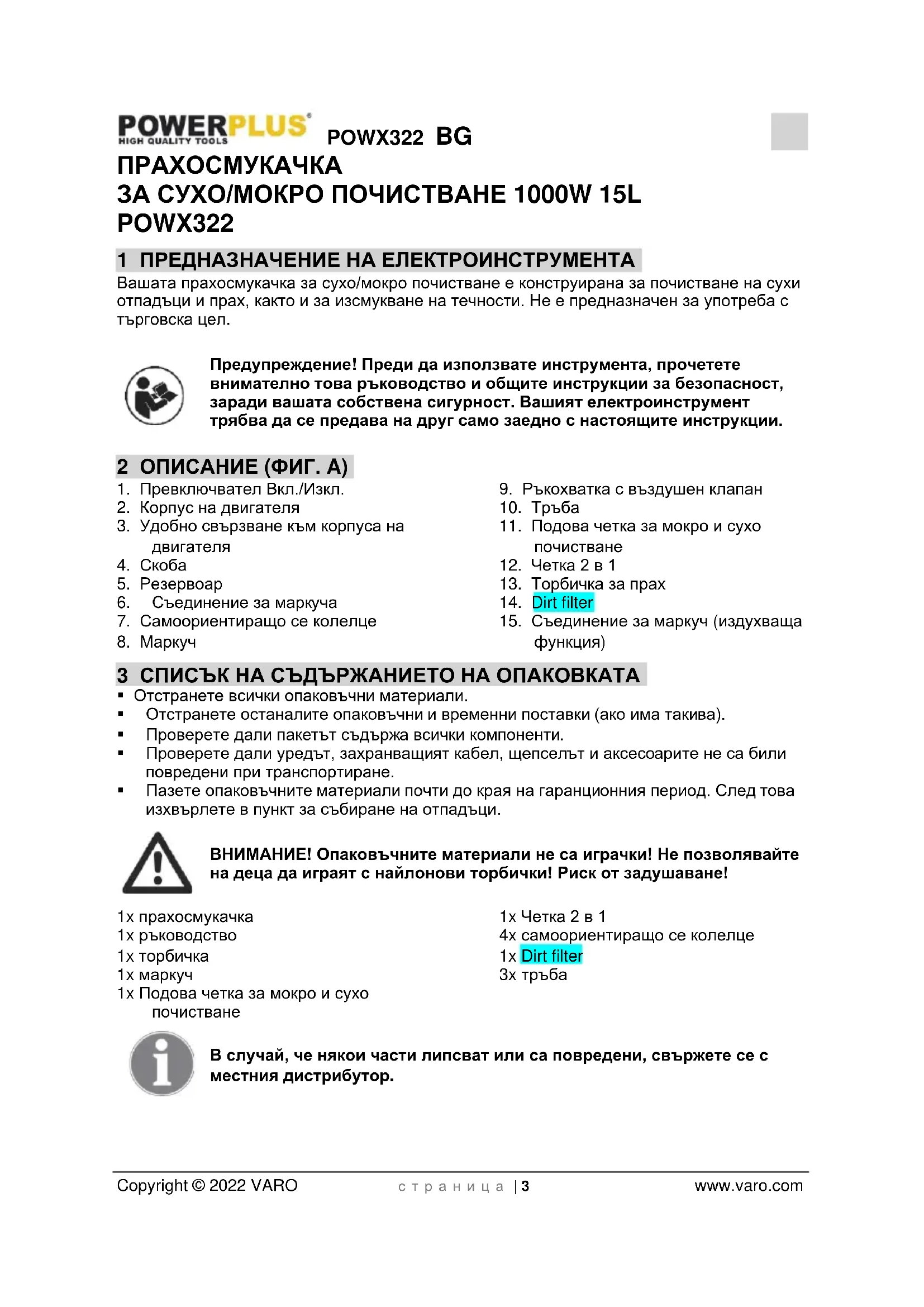 - 15 ДЕКЛАРАЦИЯ ЗА СЪОТВЕТСТВИЕ POWX322 BG Copyright © 2022 VARO с т р а н и ц а | 3 www.varo.com ПРАХОСМУКАЧКА ЗА СУХО/МОКРО ПОЧИСТВАНЕ 1000W 15L POWX322 1 ПРЕДНАЗНАЧЕНИЕ НА ЕЛЕКТРОИНСТРУМЕНТА Вашата прахосмукачка за сухо/мокро почистване е конструирана за почистване на сухи отпадъци и прах, както и за изсмукване на течности. Не е предназначен за употреба с търговска цел. Предупреждение! Преди да използвате инструмента, прочетете внимателно това ръководство и общите инструкции за безопасност, заради вашата собствена сигурност. Вашият електроинструмент трябва да се предава на друг само заедно с настоящите инструкции. 2 ОПИСАНИЕ (ФИГ. A) p. 10