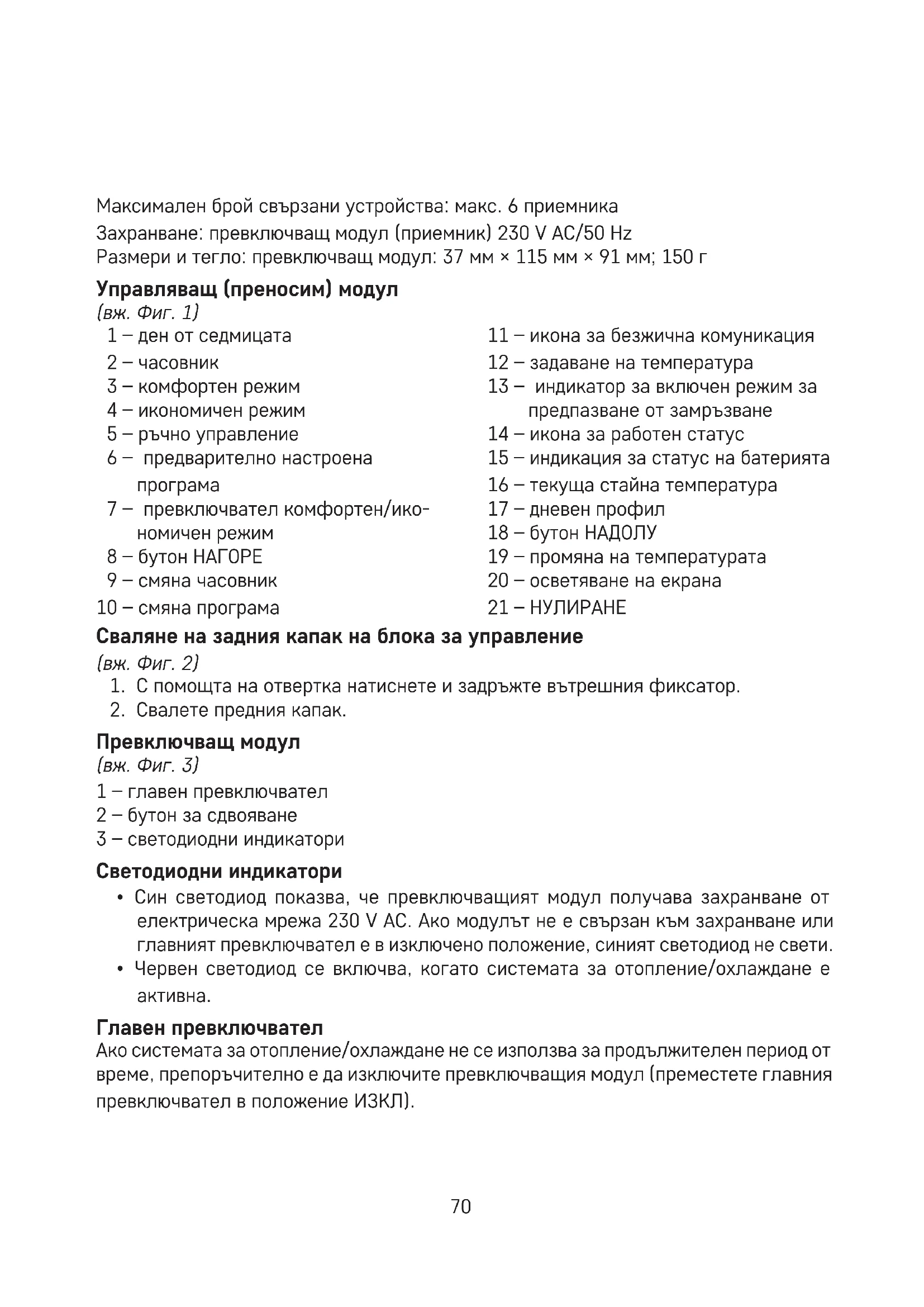 Работна температура: от 0°C до 40°C Температура на съхранение: от -10°C до 60°C Взаимосвързаност на уреда: чрез радиосигнал с честота 868 MHz, макс. 25 mW e.r.p.70 Максимален брой свързани устройства: макс. 6 приемника Захранване: превключващ модул (приемник) 230 V AC/50 Hz Размери и тегло: превключващ модул: 37 мм × 115 мм × 91 мм; 150 г Управляващ (преносим) модул (вж. Фиг. 1) 1 – ден от седмицата 2 – часовник 3 – комфортен режим 4 – икономичен режим 5 – ръчно управление 6 – предварително настроена