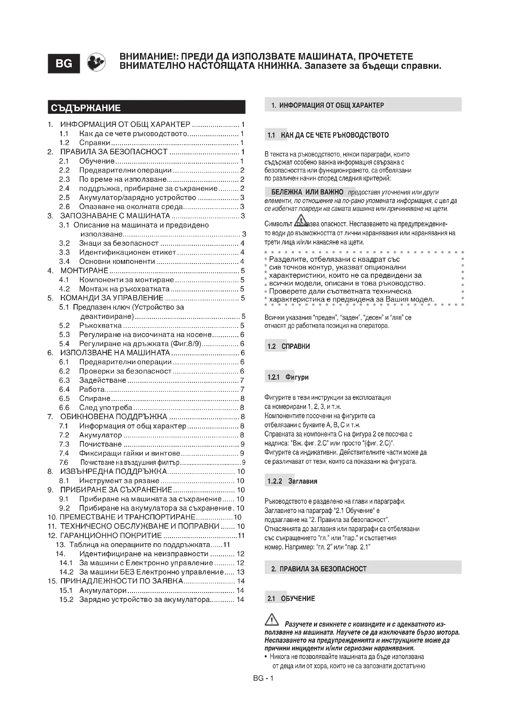 Ръководството е разделено на глави и параграфи. Заглавието на параграф "2.1 Обучение" е подзаглавие на "2. Правила за безопасност". Отнасянията до заглавия или параграфи са отбелязани със съкращението "гл." или "пар." и съответния номер. Например: “гл. 2” или “пар. 2.1”