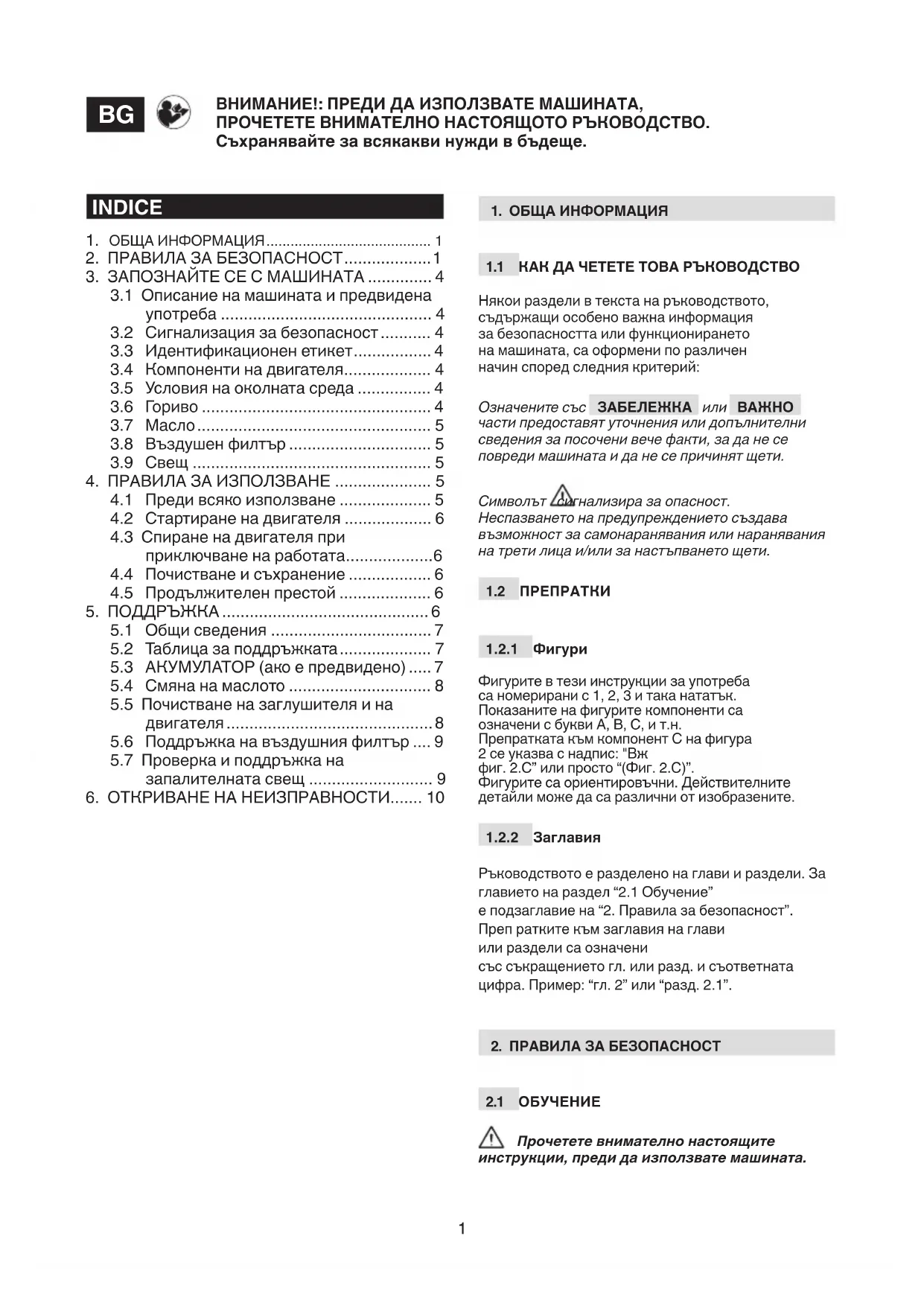 Ръководството е разделено на глави и раздели. За главието на раздел “2.1 Обучение” е подзаглавие на “2. Правила за безопасност”. Преп ратките към заглавия на глави или раздели са означени със съкращението гл. или разд. и съответната цифра. Пример: “гл. 2” или “разд. 2.1”.