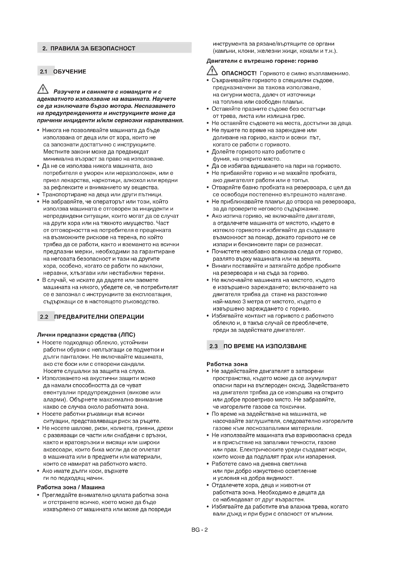 - Избягвайте контакт на горивото с работното облекло и, в такъв случай се преоблечете, преди за задействате двигателят.