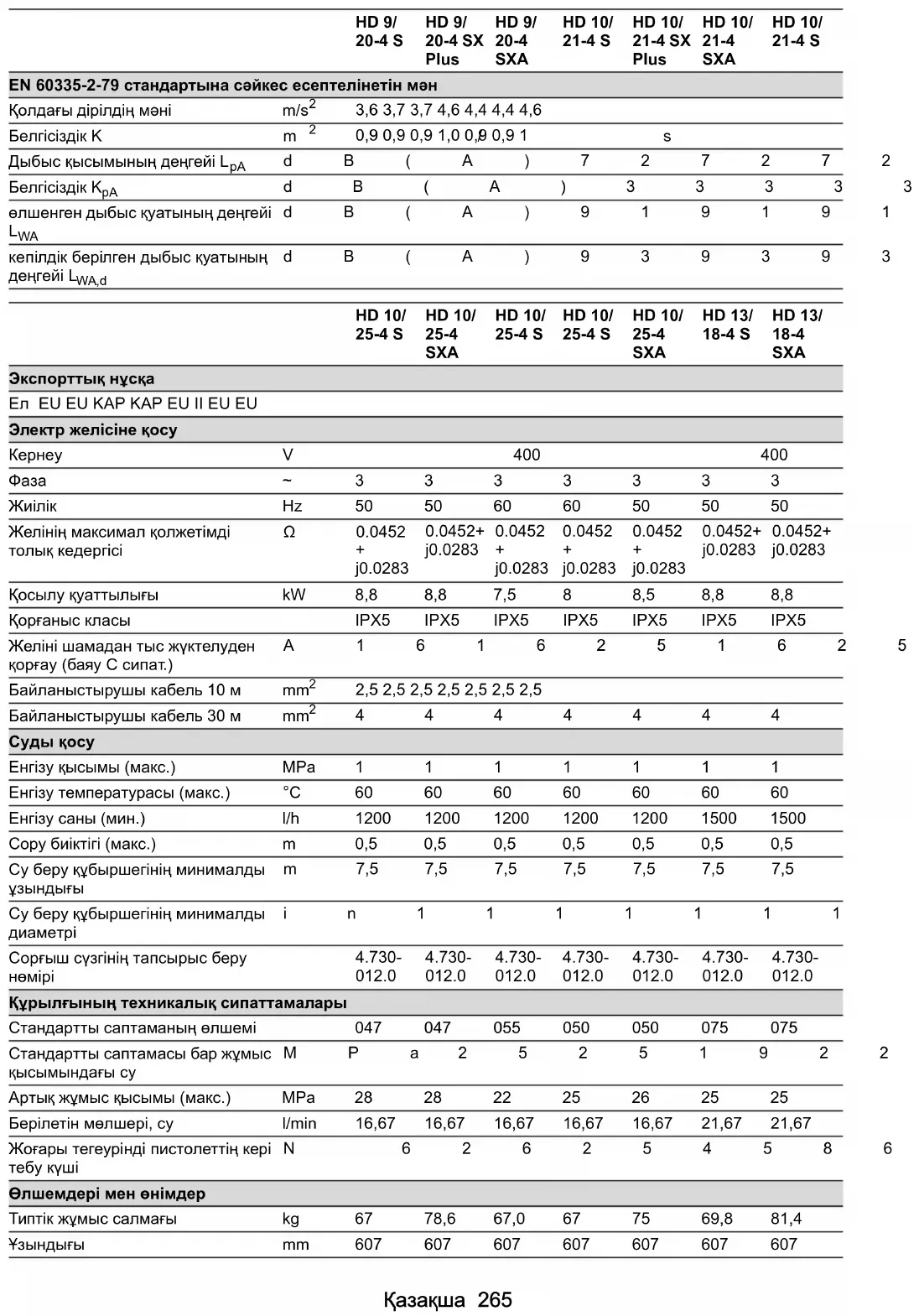 Работно налягане на водата със стандартна дюза MPa25251922231818 Работно свръхналягане (макс.)MPa28282225262525 Дебит, вода l/min 16,67 16,67 16,67 16,67 16,67 21,67 21,67 Реактивна сила на пистолета за работа под високо налягане N 62625458606868 Размери и тегла Типично собствено тегло kg 67 78,6 67,0 67 75 69,8 81,4 Дължина mm 607 607 607 607 607 607 607 Широчина mm 518 518 518 518 518 518 518 Височина mm 1063 1063 1063 1063 1063 1063 1063 Количество на маслото l 1,01,01111,01,0 Вид масло Тип SAE 90 SAE 90 SAE 90 SAE 90 SAE 90 SAE 90 SAE 90 Установени стойности съгласно EN 60335-2-79 Стойност на вибрацията ръка-