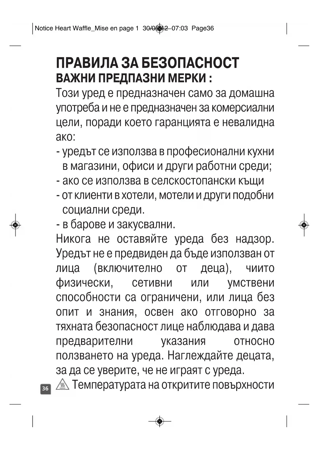 - уредът се използва в професионални кухни в магазини, офиси и други работни среди; - ако се използва в селскостопански къщи - от клиенти в хотели, мотели и други подобни социални среди. - в барове и закусвални. Никога не оставяйте уреда без надзор. Уредът не е предвиден да бъде използван от лица (включително от деца), чиито физически, сетивни или умствени способности са ограничени, или лица без опит и знания, освен ако отговорно за тяхната безопасност лице наблюдава и дава предварителни указания относно ползването на уреда. Наглеждайте децата, за да се уверите, че не играят с уреда. Температурата на откритите повърхности Notice Heart Waffle_Mise en page 1 30/05/12 07:03 Page3637