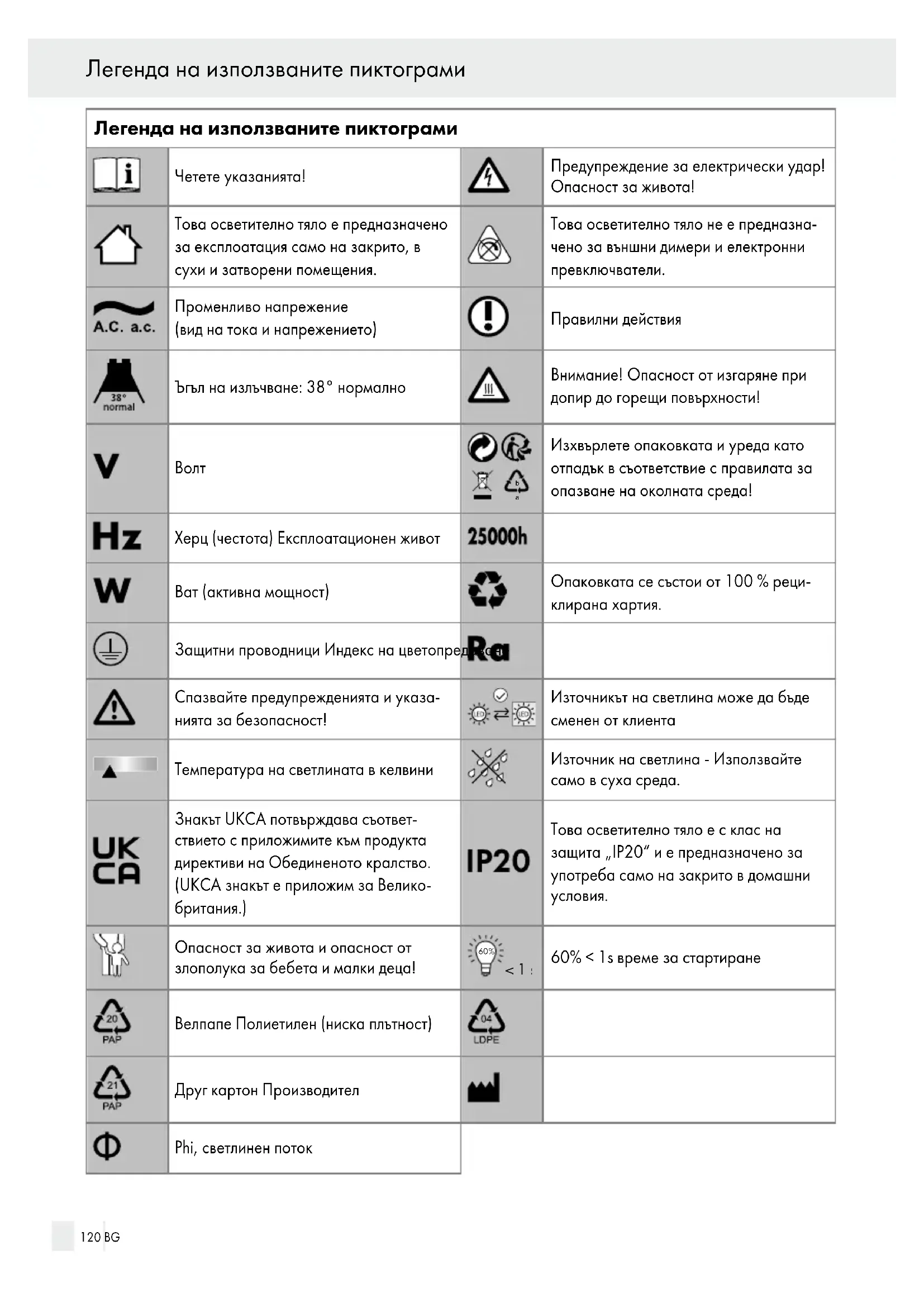 BG 119Легенда на използваните пиктограми Четете указанията! Предупреждение за електрически удар! Опасност за живота! Това осветително тяло е предназначено за експлоатация само на закрито, в сухи и затворени помещения. Това осветително тяло не е предназна чено за външни димери и електронни превключватели. Променливо напрежение (вид на тока и напрежението) Правилни действия Ъгъл на излъчване: 38° нормално Внимание! Опасност от изгаряне при допир до горещи повърхности!