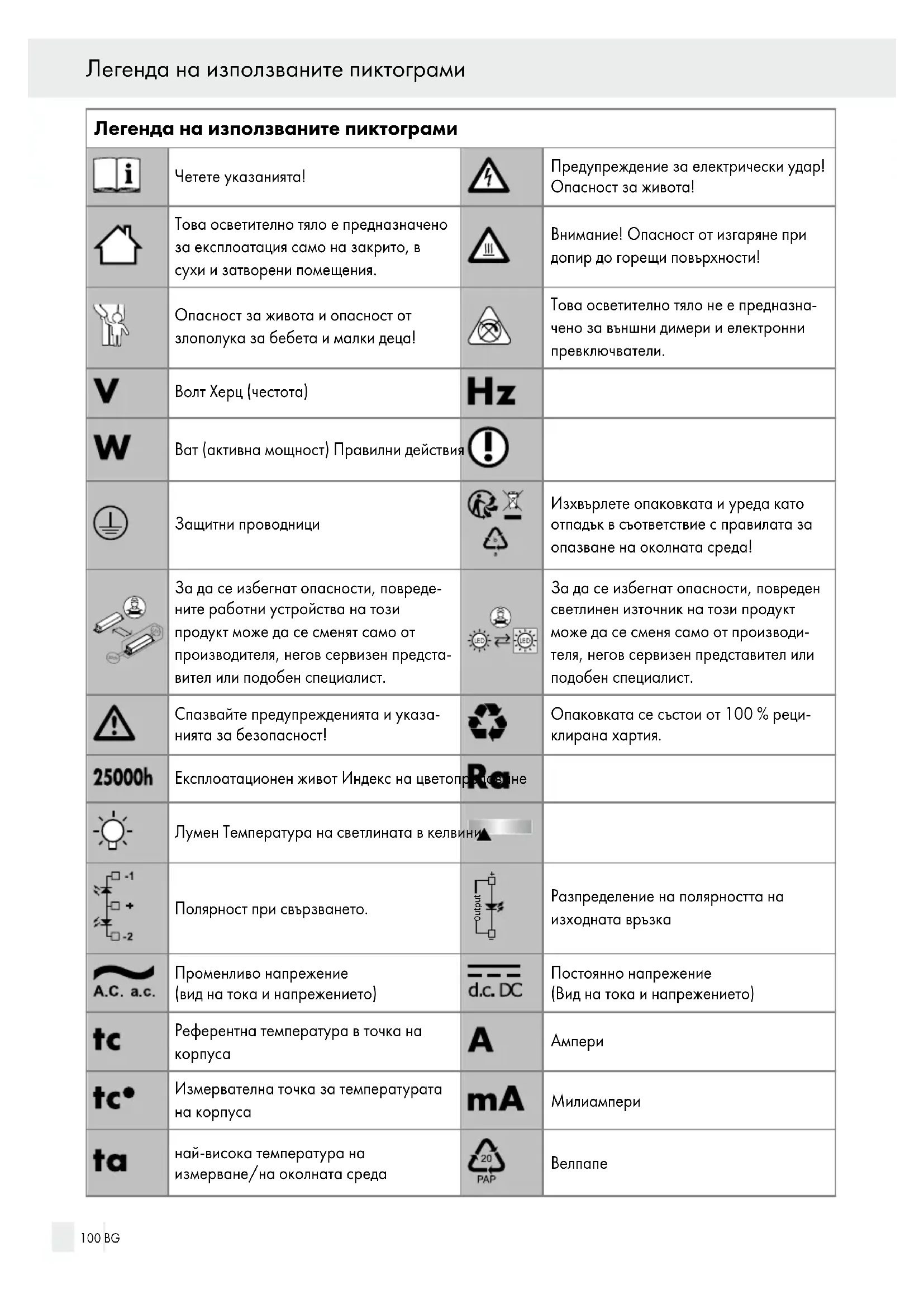 BG 99Легенда на използваните пиктограми Четете указанията! Предупреждение за електрически удар! Опасност за живота! Това осветително тяло е предназначено за експлоатация само на закрито, в сухи и затворени помещения. Внимание! Опасност от изгаряне при допир до горещи повърхности! Опасност за живота и опасност от злополука за бебета и малки деца! Това осветително тяло не е предназна чено за външни димери и електронни превключватели. Волт Херц (честота) Ват (активна мощност) Правилни действия Защитни проводници Изхвърлете опаковката и уреда като отпадък в съответствие с правилата за опазване на околната среда! За да се избегнат опасности, повреде ните работни устройства на този продукт може да се сменят само от производителя, негов сервизен предста вител или подобен специалист. За да се избегнат опасности, повреден светлинен източник на този продукт може да се сменя само от производи теля, негов сервизен представител или подобен специалист. Спазвайте предупрежденията и указа нията за безопасност! Опаковката се състои от 100 % реци клирана хартия. Експлоатационен живот Индекс на цветопредаване Лумен Температура на светлината в келвини Полярност при свързването. Output Разпределение на полярността на изходната връзка Променливо напрежение (вид на тока и напрежението) Постоянно напрежение (Вид на тока и напрежението) Референтна температура в точка на