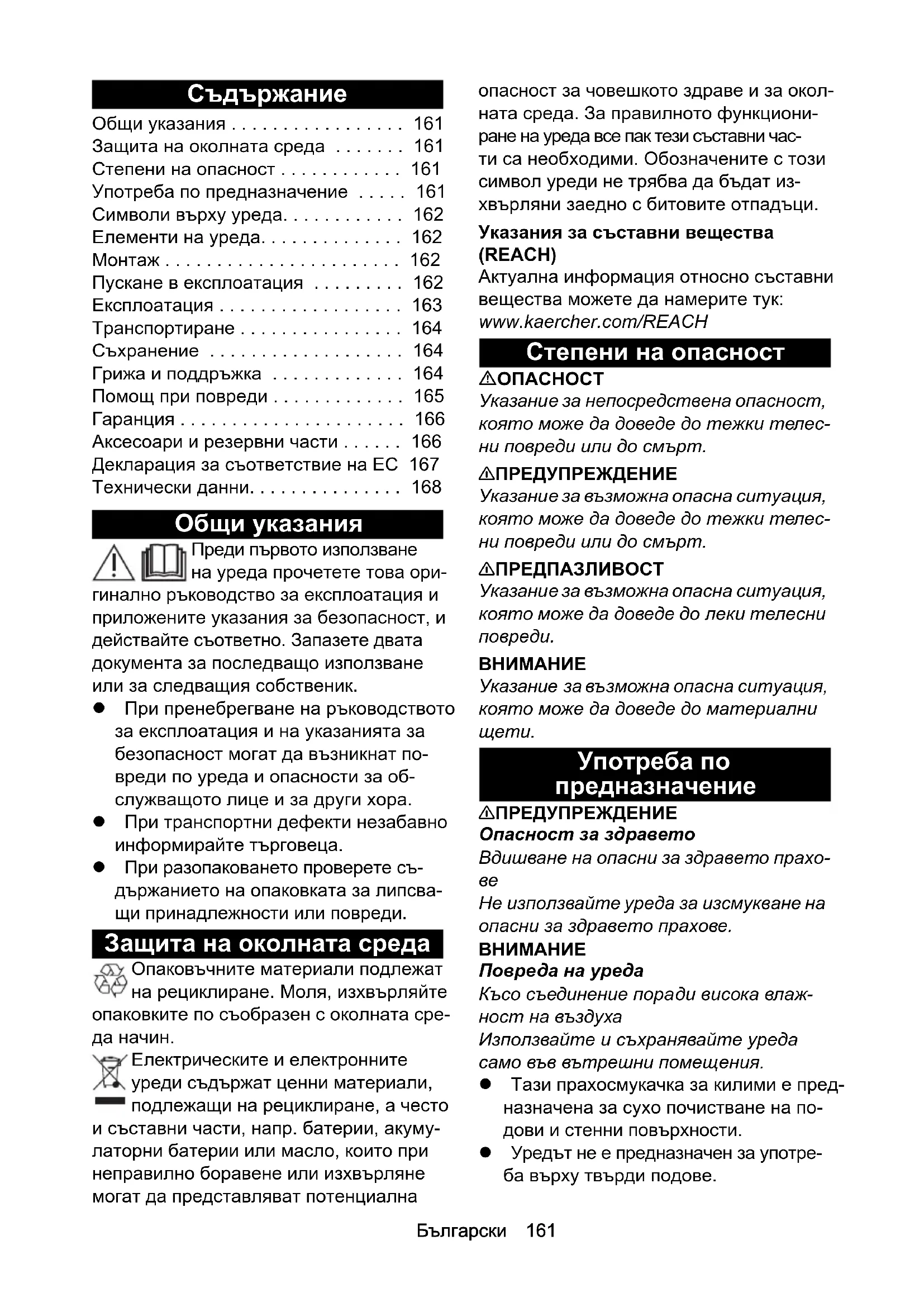 Електрическите и електронните уреди съдържат ценни материали, подлежащи на рециклиране, а често и съставни части, напр. батерии, акуму- латорни батерии или масло, които при неправилно боравене или изхвърляне могат да представляват потенциална опасност за човешкото здраве и за окол- ната среда. За правилното функциони- ране на уреда все пак тези съставни час- ти са необходими. Обозначените с този символ уреди не трябва да бъдат из- хвърляни заедно с битовите отпадъци. Указания за съставни вещества (REACH) Актуална информация относно съставни вещества можете да намерите тук: www.kaercher.com/REACH Степени на опасност