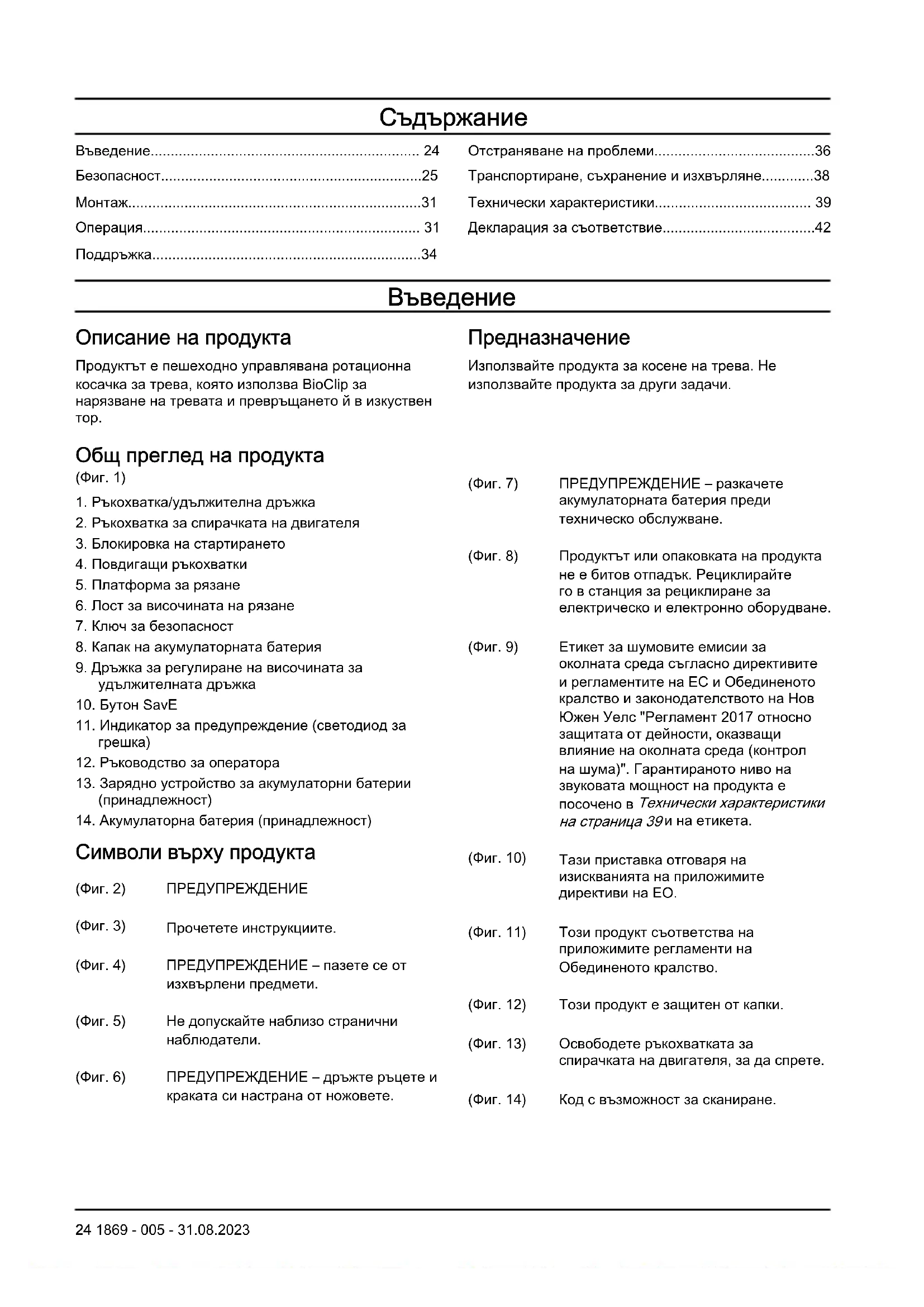 Технически характеристики на страница 39 и на етикета. (Фиг. 10) Тази приставка отговаря на изискванията на приложимите директиви на EO. (Фиг. 11) Този продукт съответства на приложимите регламенти на Обединеното кралство. (Фиг. 12) Този продукт е защитен от капки. (Фиг. 13) Освободете ръкохватката за спирачката на двигателя, за да спрете. (Фиг. 14) Код с възможност за сканиране. 24 1869 - 005 - 31.08.2023Забележка: Останалите символи/стикери на продукта се отнасят до изисквания по отношение на сертификати за определени пазари. Етикет върху продукта (Фиг. 15) ОПАСНОСТ – Дръжте ръцете и краката си настрана. Повреда на продукта Ние не носим отговорност за повреди по нашия продукт, ако: