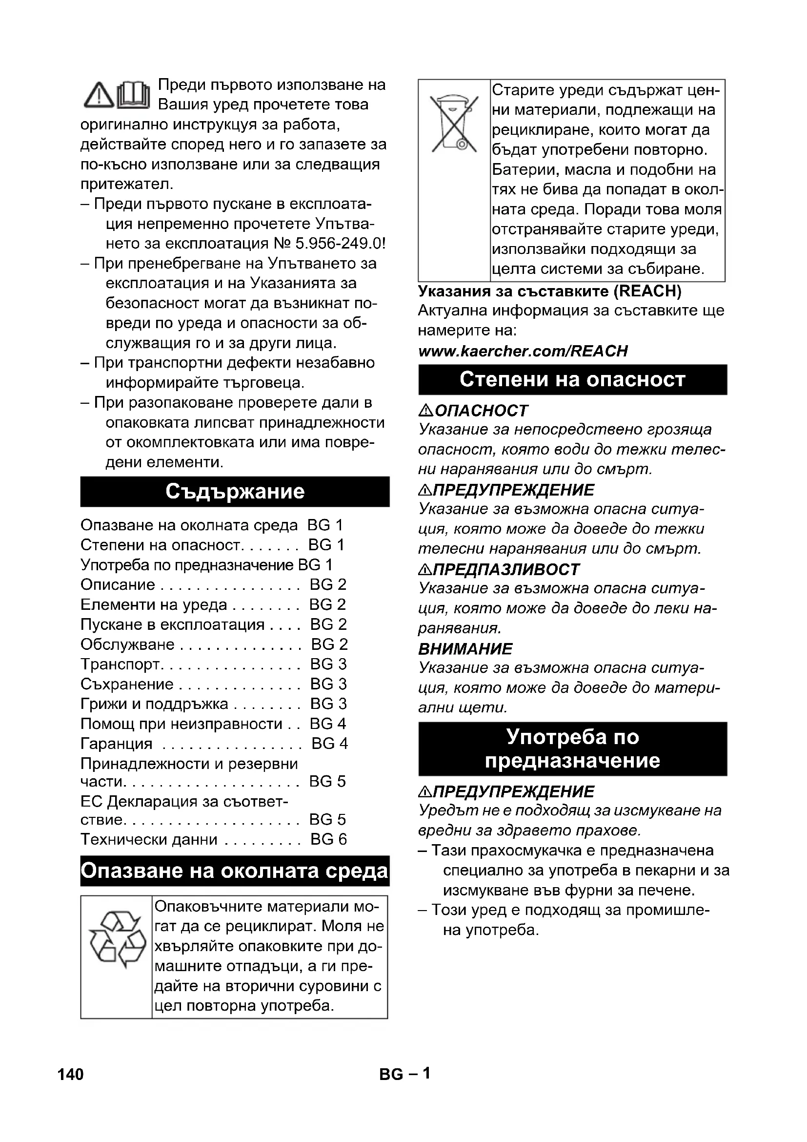 몇 ПРЕДУПРЕЖДЕНИЕ Уредът не е подходящ за изсмукване на вредни за здравето прахове. – Тази прахосмукачка е предназначена специално за употреба в пекарни и за изсмукване във фурни за печене. – Този уред е подходящ за промишле- на употреба.